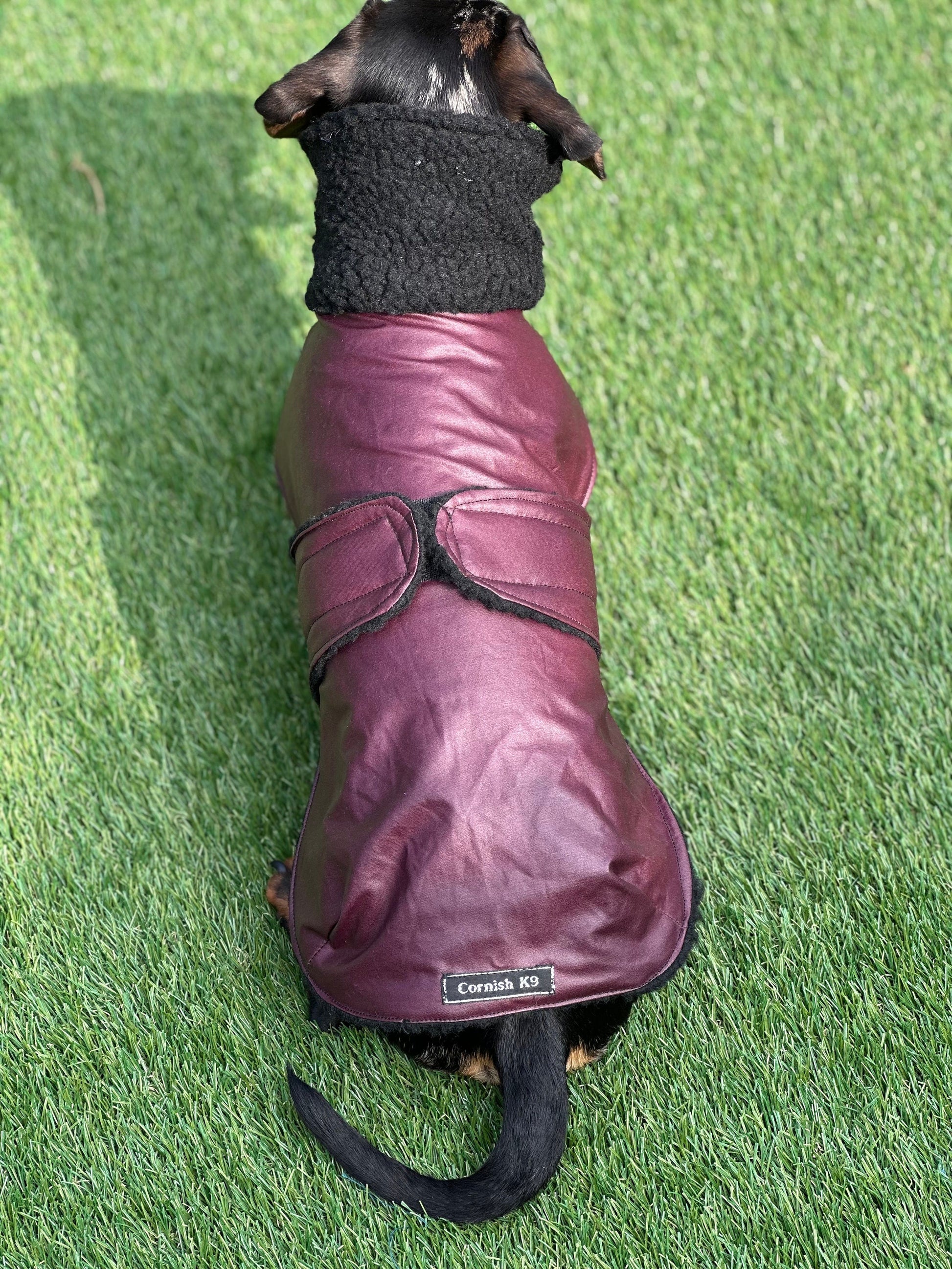 Waterproof dry wax dachshund coat that covers chest with neck warmer lined with Sherpa fleece there is darts in the back to give the coat shape The coat can be made with a harness hole or a dring just add a note if you would like with one This is a waterproof dog coat Waxed canvas is a densely woven cotton fabric that has been saturated with wax, giving it an extra layer of protection against the elements. This fabric has been long-loved for its durability, natural water resistance, and rugged character. Sherpa fleece is designed to withstand the chilliest temperatures, offering a cocoon of warmth There is 6 Sherpa fleece colours to choose from Olive ,red,navy,grey,brown,black the coat fastens on the sides with hock and loop the coat is Stitched with Strong bonded nylon thread which is rote proof This Coat comes in these sizes ,but I can adjust the length if needed Xxs neck 6-8 inches girth 12-14 inches length 10 inches Xs neck 9-11 inches girth 14-17 inches length 12 inches Small neck 10-13inches girth 17-21 inches length 14 inches Medium neck 12-15 inches girth 21-24inches length 16inches Large neck 15-16 inches girth 25-28 inches length 18 inches I would recommend by going by the girth & neck measurements for reference my Winnie in the photo is wearing a xs in wine with black Sherpa fleece with added length Please double check your sizes before ordering Please note there might be a few centimetres difference in each coat as there all hand cut out The waterproof dry wax fabric naturally repels water and dirt so a quick brush is all that is needed. If in the event that your item needs washing,low heated wash only air dry This is a made to order item made by me in a smoke free studio Please note the coat may differ in colour slightly depending on your screen resolution and Camera light