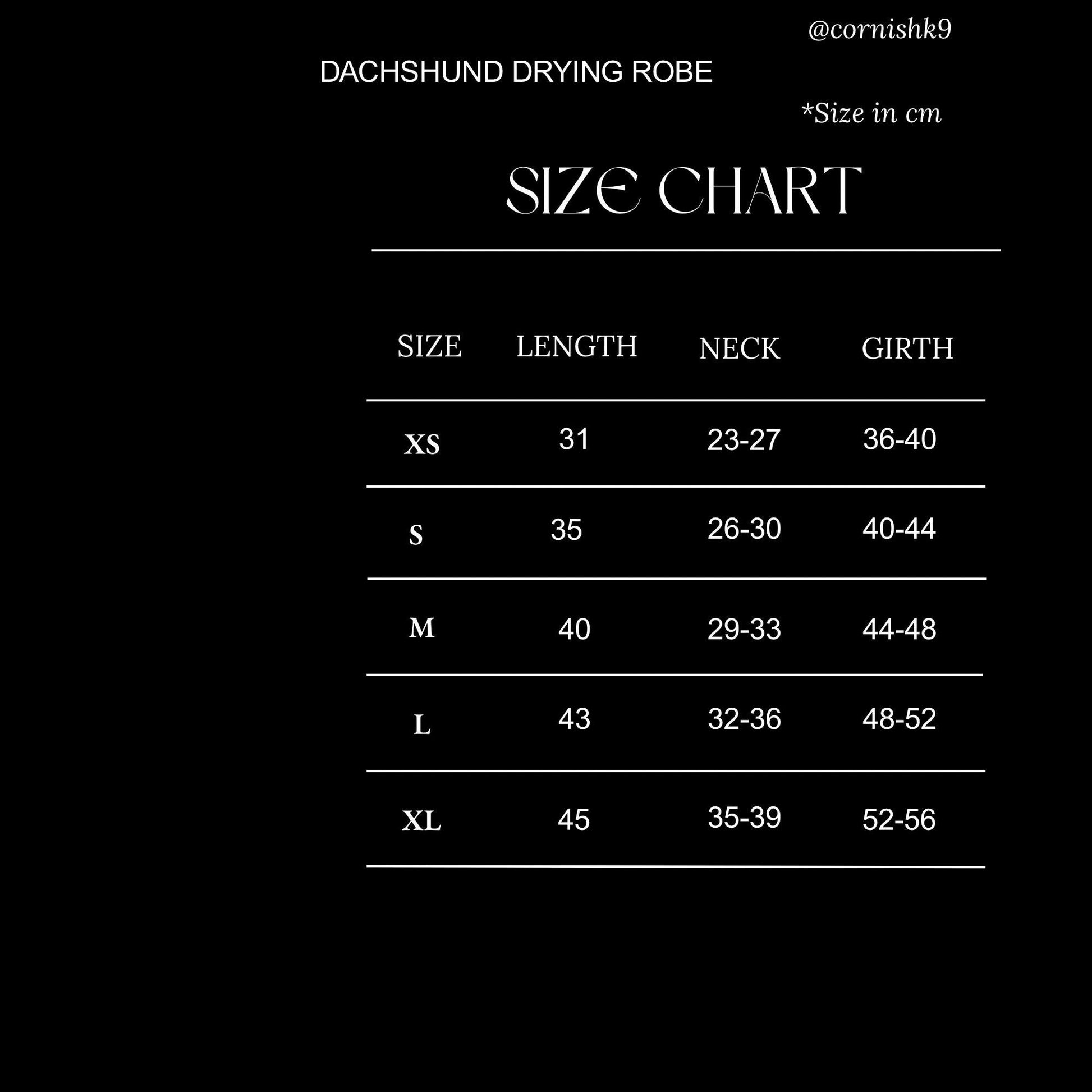 Double layered dachshund drying robe with hood The drying robe is made from Two layers of absorbent cotton Terry towelling the towelling wicks moisture away from your dog, the soft cotton is comfortable and cosy for them to wear. So no more shivering in the back of the car after a wet muddy walk ,swimming in the sea , after dogs hydrotherapy session or even after a bath. With the drying robe there’s no more wet dog smells or endless rubbing down simply pop it over the dachshund and fasten the Velcro neck & tie the belt which goes under the the belly and through the belt loops and that’s it The drying robe dries the dog quicker than you can it does all the work for you. The robe can be personalised with pets name if you wish There’s 15 towelling colours to choose from you can have all one colour or mix and match the towelling 1 for the outside and 1 for the lining Length can be added to the robe if needed The drying robe is fully washable at 30 degrees and can be tumbled