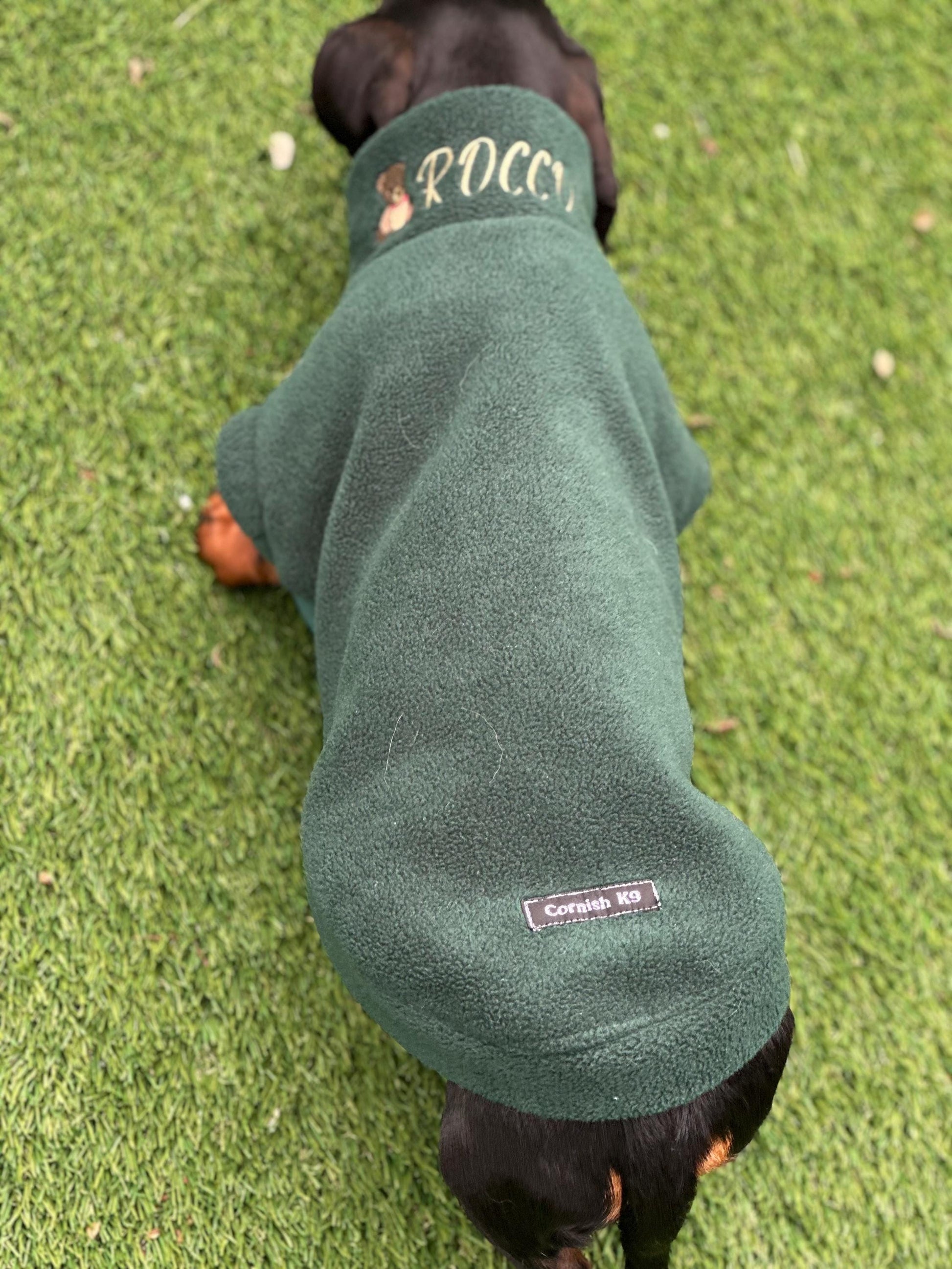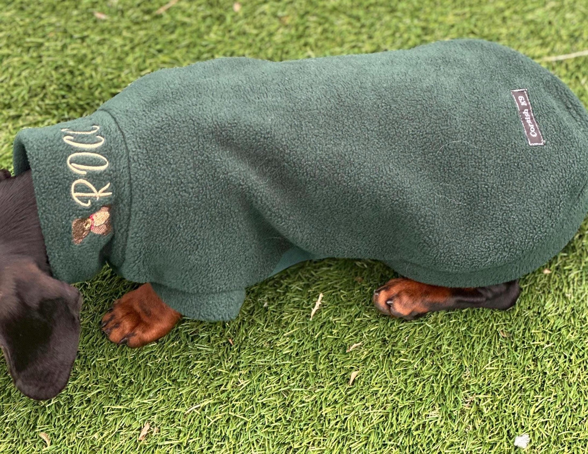 dachshund fleece jumper with waterproof soft shell tummy the fleece will match the soft shell tummy unless you’ve asked for a different colour This is a slip on jumper PLEASE NOTE THIS FABRIC DOES NOT STRETCH LIKE FLEECE. You can get your dog in and out without a zip but for elderly or arthritic dogs l would recommend ordering a zip. Please note the jumper may be a bit big to begin with to allow for shrinkage once washed The coats sizes are from back of the neck to were the tail begins Xs length 32cm chest 32-39cm neck 20-24cm Small Length 37 cm chest 39-44cm neck 24-29 Medium length 41cm chest 44-49cm neck 29-34cm Large length 43cm chest 49-54cm neck 33-38cm XL length 45cm chest 55-60cm neck 36-41cm All seams have been overlocked personalised items are non refundable please double check before ordering else your item will either be to big or too small for your dog or message me for help Please note there might be a few centimetres difference in each coat as there all hand cut out When coat needs washing wash at 30 degrees only air dry I do have other sizes available for other dog breeds just drop me message with neck length girth sizes All items are made by myself from my pet accessories business called Cornish K9 Water Resistant: Fleece is hydrophobic, meaning that it cannot absorb water. This is great for dogs who are likely to get stuck in the rain and mud . However, the fabric is not waterproof, although it will dry quickly if it becomes wet. Warmth: The warmth of fleece is mainly due to its ability to trap your body’s heat. This is similar to down jackets, minus the weight. If warmth is what you are looking for, a polar fleece jacket is exactly what you need. Breathability: Another key part of a fleece jacket is its breathability. Fleece jackets are great for dogs who are active because they provide warmth without causing you to sweat too much or become overheated. This is a made to order item made by me in a smoke free studio Please note the coat may differ in colour slightly depending on your screen resolution and Camera light Please visit my shop to see my other dog harness and dog coats