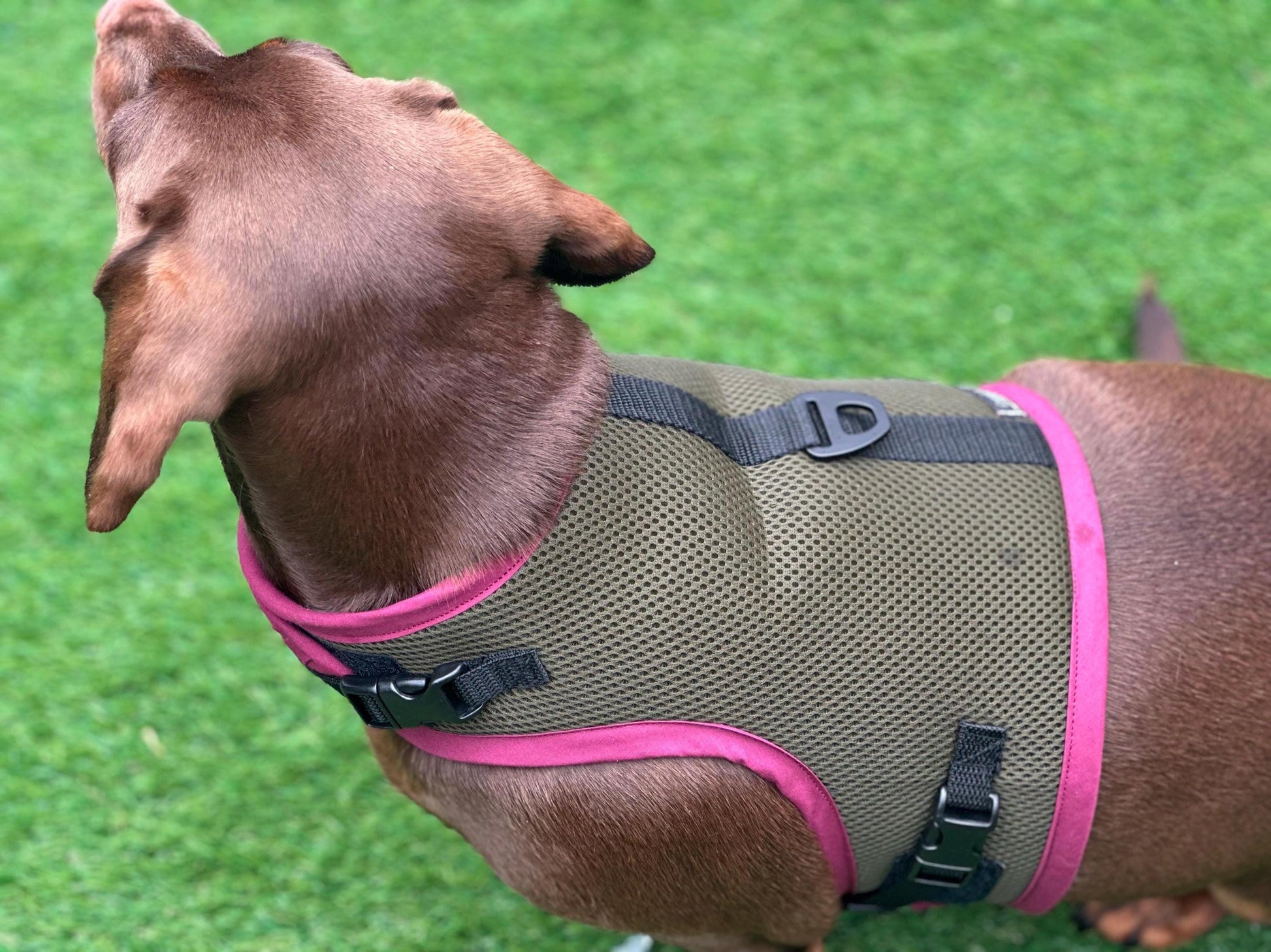Made to order army green spacer mesh dachshund harness lined in black spacer mesh with burgundy trim it has d ring on top so you can clip your dogs lead to the harness the harness fastens underneath with hock and loop which is fully adjustable it also has buckles for extra security. this is great for dachshunds as there’s no armpit rub spacer mesh harnesses offer excellent cushioning and support, reducing the risk of chafing and ensuring your dog remains comfortable during their excursions. The spacer mesh is a cushioned fabric which is also breathable Be sure to measure your pet's length, chest and neck before ordering LENGTH: The Back Length measurement is taken from the base of the neck where collar would sit to just past the front legs but the length can be adjusted if needed CHEST: Measure your pet around the chest, at the widest point, which is generally found behind the front legs. NECK: The neck measurement is taken around the pet's neck where the collar would naturally sit. my dachshund in photos measurements are neck is 13” chest 23” length 18.5” Please visit my shop to see my other dog harness