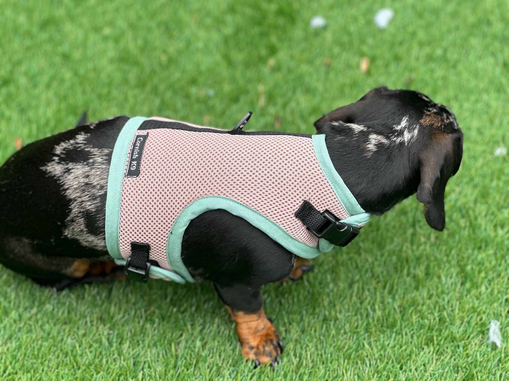 Made to order spacer mesh dachshund harness lined in black plain spacer mesh There is 6 spacer mesh colours available brown with beige trim purple with hot pink trim red with navy trim wine with green trim dusty pink with sage trim light blue with teal trim it has d ring on top so you can clip your dogs lead to the harness the harness fastens underneath with hock and loop which is fully adjustable it also has buckles for extra security. this is great for dachshunds as there’s no armpit rub spacer mesh harnesses offer excellent cushioning and support, reducing the risk of chafing and ensuring your dog remains comfortable during their excursions. The spacer mesh is a cushioned fabric which is also breathable Be sure to measure your pet's length, chest and neck before purchasing LENGTH: The Back Length measurement is taken from the base of the neck where collar would sit to top of the tail CHEST: Measure your pet around the chest, at the widest point, which is generally found behind the front legs. NECK: The neck measurement is taken around the pet's neck where the collar would naturally sit. my mini dachshund in photos is wearing Dusty rose with sage trim her measurements are neck 23cm girth 38cm length 38cm Please visit my shop to see my other dog harness
