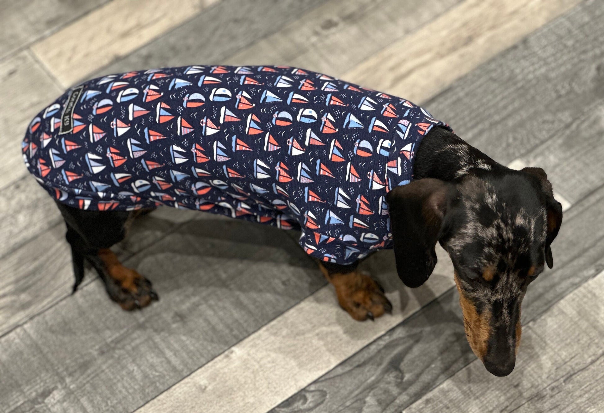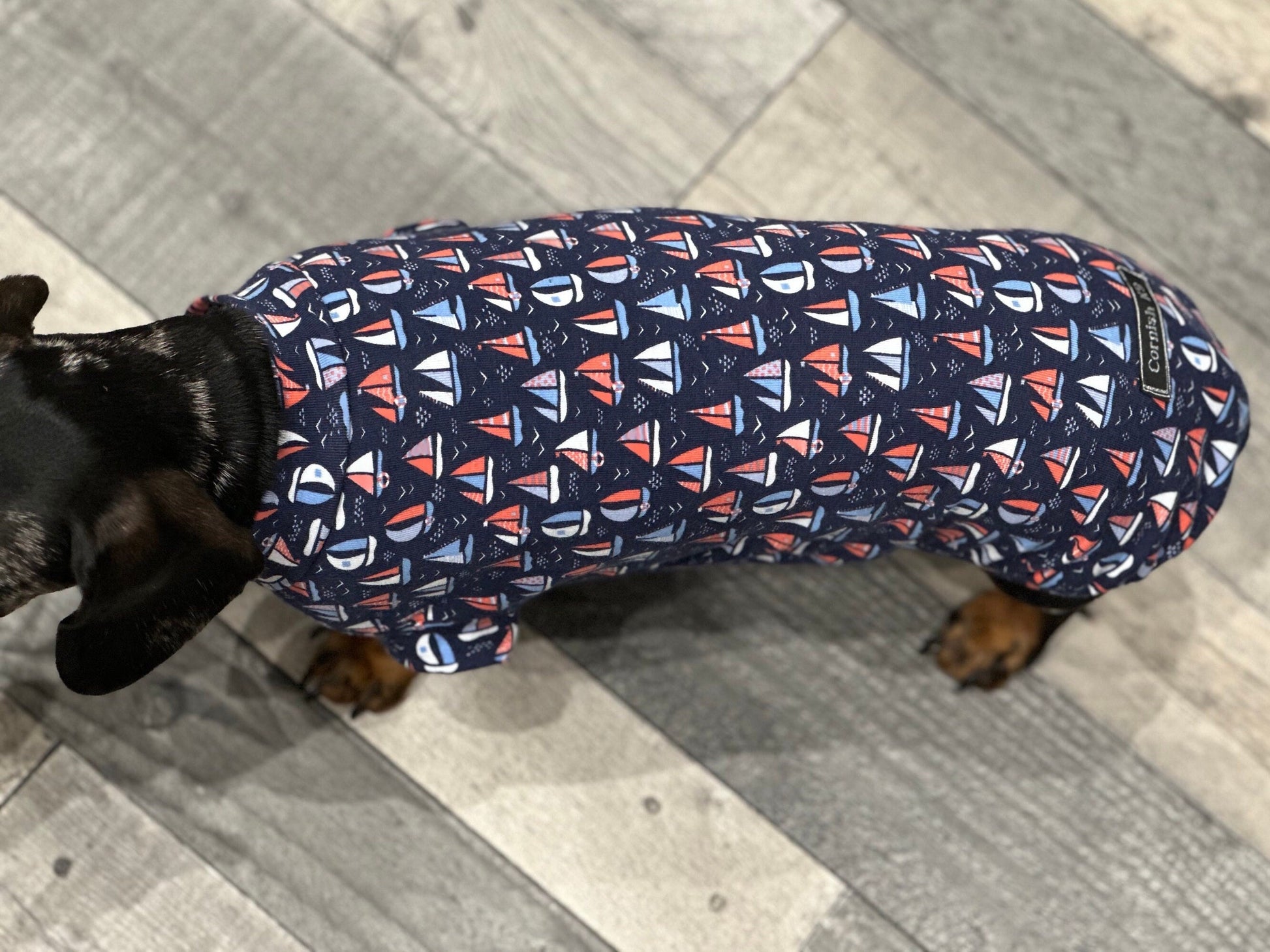 dachshund jersey Nautical Print jumper This is a slip on jumper . Please note the jumper may be a bit big to begin with to allow for shrinkage once washed The coats sizes are from back of the neck to were the tail begins Xs length 32cm chest 32-39cm neck 20-24cm Small Length 37 cm chest 39-44cm neck 24-29 Medium length 41cm chest 44-49cm neck 29-34cm Large length 43cm chest 49-54cm neck 33-38cm XL length 45cm chest 55-60cm neck 36-41cm All seams have been overlocked to stop fraying personalised items are non refundable please double check before ordering else your item will either be to big or too small for your dog or message me for help Please note there might be a few centimetres difference in each coat as there all hand cut out When Tshirt needs washing wash at 30 degrees only air dry DONT USE FABRIC SOFTENER This is a made to order item made by me in a smoke free studio Please note the coat may differ in colour slightly depending on your screen resolution and Camera light Please visit my shop to see my other dog harness and dog coats