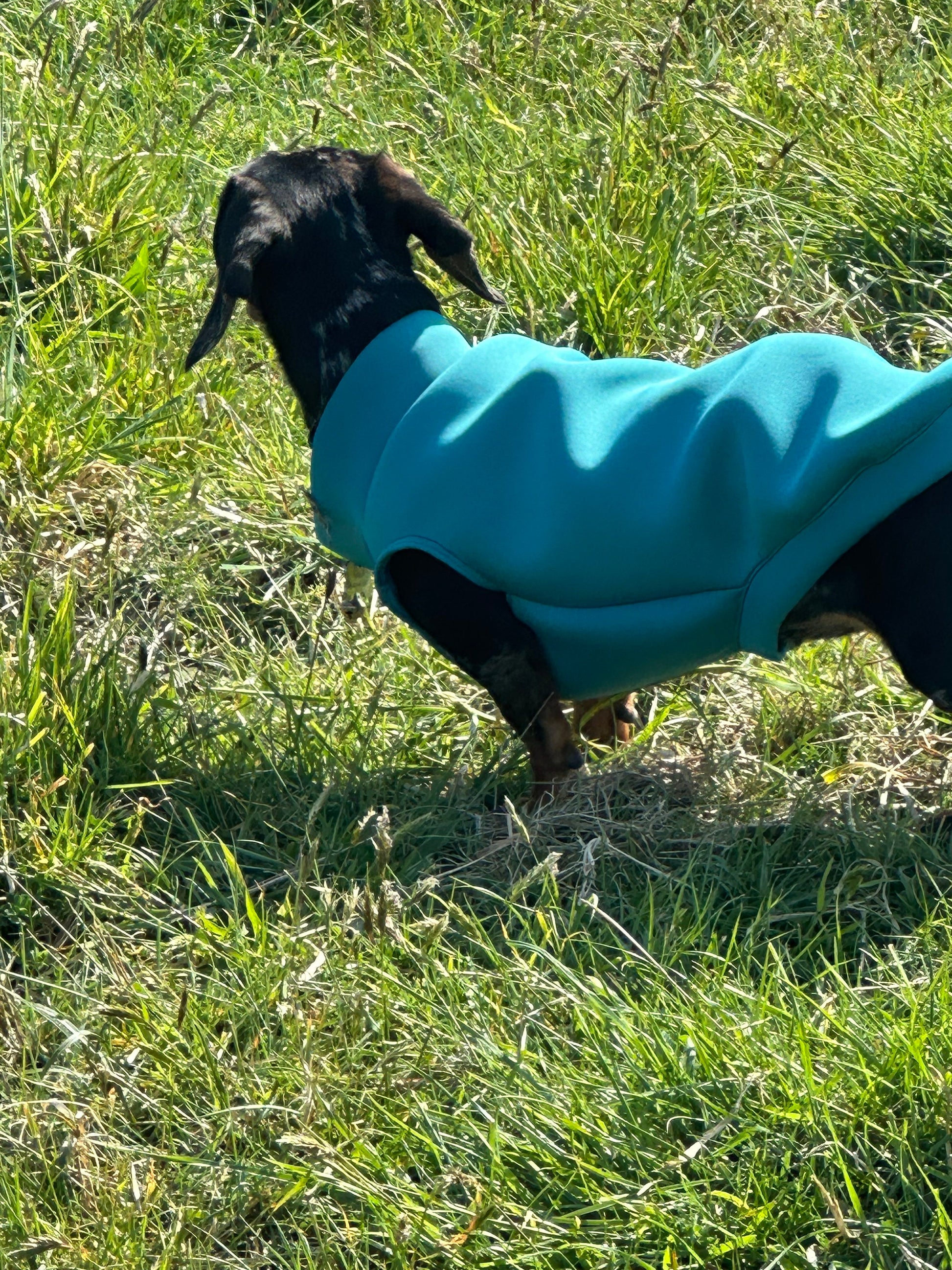 dachshund neoprene top the top is with out legs and open front neck I can alter the length and girth by a little bit if needed just send me a message first This is a slip on jumper but neoprene is super stretchy so there’s no more struggling to get the jumper on The jumper sizes are from back of the neck to were the tail begins Xs length 32cm chest 32-39cm neck 20-24cm Small Length 37 cm chest 39-44cm neck 24-29 Medium length 41cm chest 44-49cm neck 29-34cm Large length 43cm chest 49-54cm neck 33-38cm XL length 45cm chest 55-60cm neck 36-41cm All seams have been overlocked to stop fraying please double check before ordering else your item will either be to big or too small for your dog Please note there might be a few centimetres difference in each coat as there all hand cut out When coat needs washing, wash in water only and air dry Neoprene fabric is a soft spongey fabric The fabric also offers a good amount of flexibility and insulation. Approximate Weight: 300GSM for reference my mini dachshund in the photos is wearing a xs in teal with added length Please note the coat may differ in colour slightly depending on your screen resolution and Camera light Please visit my shop to see my other dog harness and dog coats