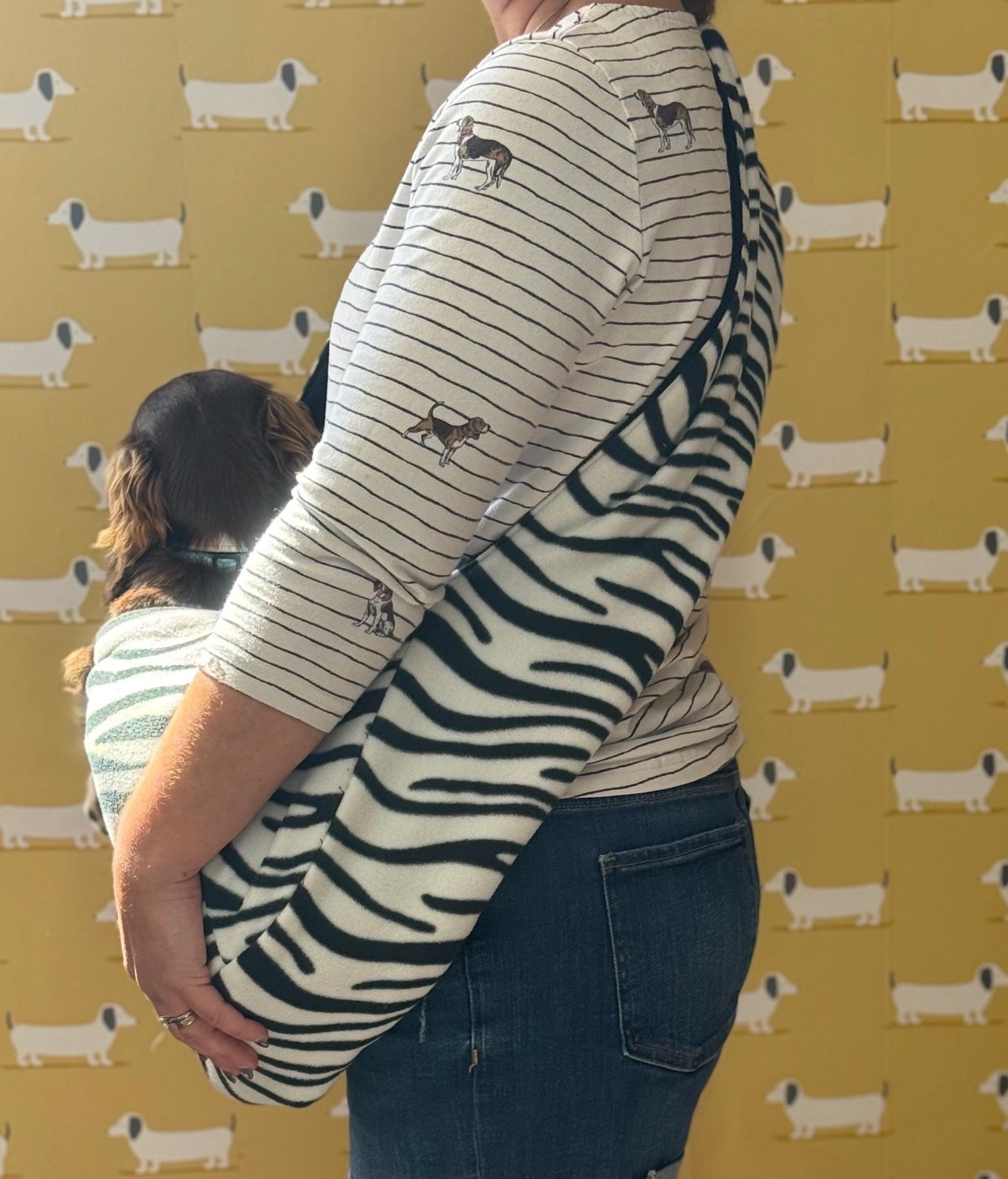 polar fleece dog sling fully lined in fleece cow and zebra print come with black fleece lining green geometric circles and tiger print come with a beige fleece lining it has a Swivel Hook inside to keep your dog safe by attaching it to collar or harness This sling carrier is lightweight and comfortable to use The sling has darts at the bottom to give it shape. the sling has a tapered strap the sling is designed to sit/ hang past the hip depending on your height it sits just blow my hip the sling evenly distributes the weight of your dog, making it easier than ever to carry them. the sling can be used all day relieving tension in your neck, back, shoulders and arms the sing sizes small 17inch’s wide at the top 15.5 inch’s wide in the middle and 14.5 inches above the darts 11 inch’s high 8” inch’s wide on the base & side then tapering off the strap is 24 inches long medium 20 inch’s wide at the top 19 inch’s wide in the middle and 17 inches above the darts 13 inch’s high 8” inch’s wide on the base & side then tapering off the strap is 24 inches long maximum weight 10kg large 24 inch’s wide at the top 23 inch’s wide in the middle and 22 inches above the darts 13 inch’s high 8” inch’s wide on the base & side then tapering off the strap is 24 inches long maximum weight 10kg It's incredibly easy to carry around , making it perfect for public places. It’s fully washable at 30 degrees This is made in a pet and smoke free studio This is a made to order item