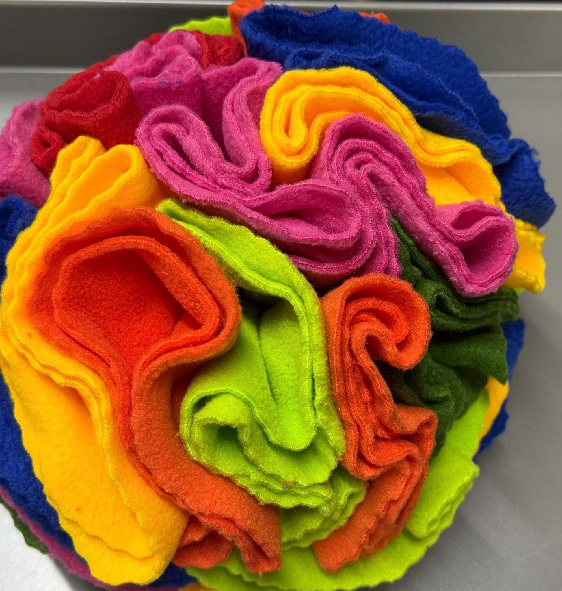 Dachshund Snuff ball these are fab for hiding treats, quick eaters or use a a enrichment toy The snuff toy can be used to encourage your pet to interact with you and provide mental exercise help tackle boredom & anxiety it reduce stress can help calm them. It provides a distraction and can help improve their problem solving skills plus mental focus. To use simply hide treats or dry food in between the fabric and watch your pooch forage and sniff them out! These are great for any size dog There made from anti pill polar fleece and secured with plastic ties. This will be made in random colours but can be made in specific colours on request The snuffle ball can be washed at 30 degrees air dry only ALWAYS SUPERVISE YOUR PET WHEN USING A SNUFFLE BALL