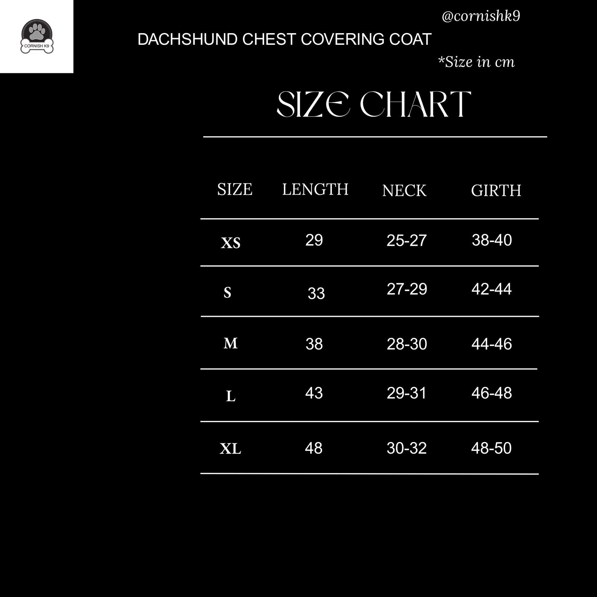Waterproof cordura dachshund coat which covers the chest with neck warmer it’s lined with grey Sherpa fleece making it warm & cozy The coat has a harness hole, plus it has elastic leg bans There is darts in the back to give the coat more shape The outer material is medium weight waterproof cordura fabric the weight of the fabric is 400 gsm the coat fastens on the sides with hock & loop it also has a buckle added to straps for extra security There is reflective paws on each side the coat can be personalised with pets just add personalisation during check out the coat is Stitched with Strong bonded nylon thread which is rote proof Please check these measurements before ordering length, neck ,girth length can be altered for better fit for reference my Winnie in photos is wearing a xs her neck is 9’’ her length is 11’’ and her girth is 13’’ Xs neck 25-27cm girth 38-40 length 29cm Small neck27-29 girth 42-44 length 33 cm Medium neck 28-30 girth 44-46 length 38cm Large neck 29-31 girth 46-48 length 43cm XL neck 30-32 girth 48-50 length 48 cm I would recommend going by the neck and girth measurements Please double check your sizes before ordering Please note there might be a few centimetres difference in each coat as there all hand cut out The waterproof fabric naturally repels water and dirt so leave to dry and quick brush is all that is needed. If in the event that your item needs washing,low heated wash only air dry Please note the coat may differ in colour slightly depending on your screen resolution and Camera light