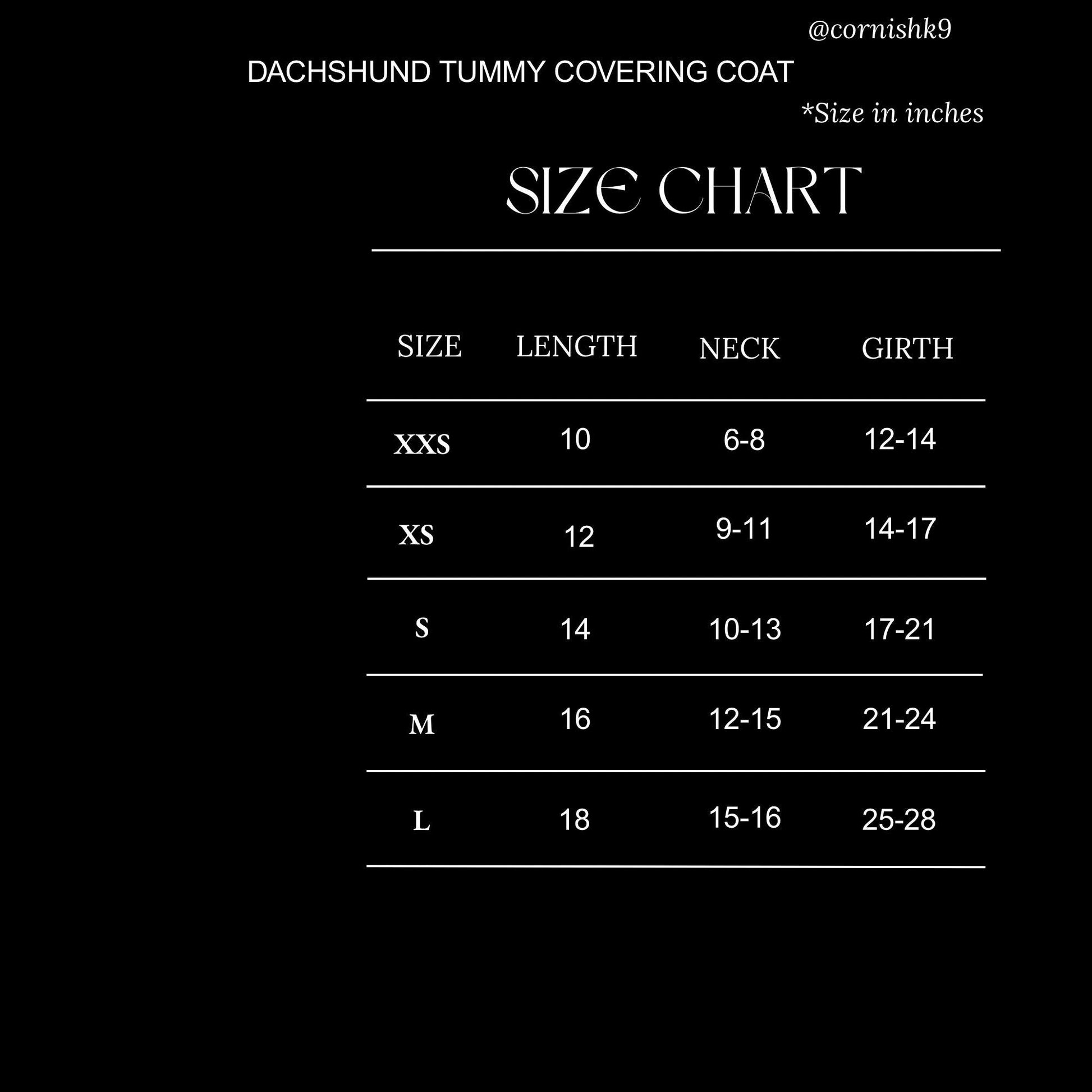 Waterproof quilted dachshund coat that covers chest with built in neck warmer lined with grey Sherpa fleece there is darts in the back to give the coat shape This quilted fabric is equipped with a waterproof layer, making it ideal for protecting against moisture and ensuring water-resistance while being lined in Sherpa fleece for extra warmth The coat can be made with a harness hole or a dring just add a note if you would like with one This is a waterproof dog coat the coat fastens on the sides with hock and loop with extra webbing strap the coat is Stitched with Strong bonded nylon thread which is rote proof This Coat comes in these sizes ,but I can adjust the length if needed Xxs neck 6-8 inches girth 12-14 inches length 10 inches Xs neck 9-11 inches girth 14-17 inches length 12 inches Small neck 10-13inches girth 17-21 inches length 14 inches Medium neck 12-15 inches girth 21-24inches length 16inches Large neck 15-16 inches girth 25-28 inches length 18 inches I would recommend by going by the girth & neck measurements for reference my Roco in the photo is wearing a xs in red camo with added length Please double check your sizes before ordering Please note there might be a few centimetres difference in each coat as there all hand cut out The waterproof quilted canvas naturally repels water and dirt so a quick brush is all that is needed. If in the event that your item needs washing,low heated wash only air dry This is a made to order item made by me in a smoke free studio Please note the coat may differ in colour slightly depending on your screen resolution and Camera light