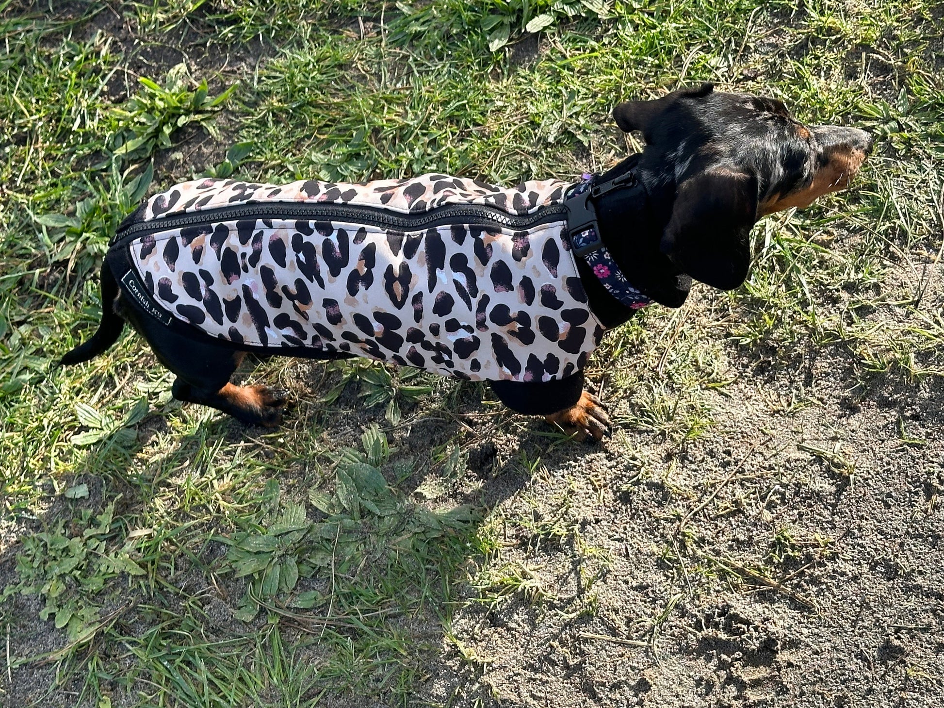 dachshund leopard print zipped soft shell fleece jumper with fleece accents This is a zip up jumper Please note the jumper may be a bit big to begin with to allow for shrinkage once washed The coats sizes are from back of the neck to were the tail begins Xs length 32cm chest 32-39cm neck 20-24cm Small Length 37 cm chest 39-44cm neck 24-29 Medium length 41cm chest 44-49cm neck 29-34cm Large length 43cm chest 49-54cm neck 33-38cm XL length 45cm chest 55-60cm neck 36-41cm All seams have been overlocked personalised items are non refundable please double check before ordering else your item will either be to big or too small for your dog or message me for help Please note there might be a few centimetres difference in each coat as there all hand cut out When coat needs washing wash at 30 degrees only air dry I do have other sizes available for other dog breeds just drop me message with neck length girth sizes Water Resistant: Fleece is hydrophobic, meaning that it cannot absorb water. This is great for dogs who are likely to get stuck in the rain and mud . However, the fabric is not waterproof, although it will dry quickly if it becomes wet. Warmth: The warmth of fleece is mainly due to its ability to trap your body’s heat. This is similar to down jackets, minus the weight. If warmth is what you are looking for, a polar fleece jacket is exactly what you need. Breathability: Another key part of a fleece jacket is its breathability. Fleece jackets are great for dogs who are active because they provide warmth without causing you to sweat too much or become overheated. This is a made to order item made by me in a smoke free studio Please note the coat may differ in colour slightly depending on your screen resolution and Camera light Please visit my shop to see my other dog harness and dog coats