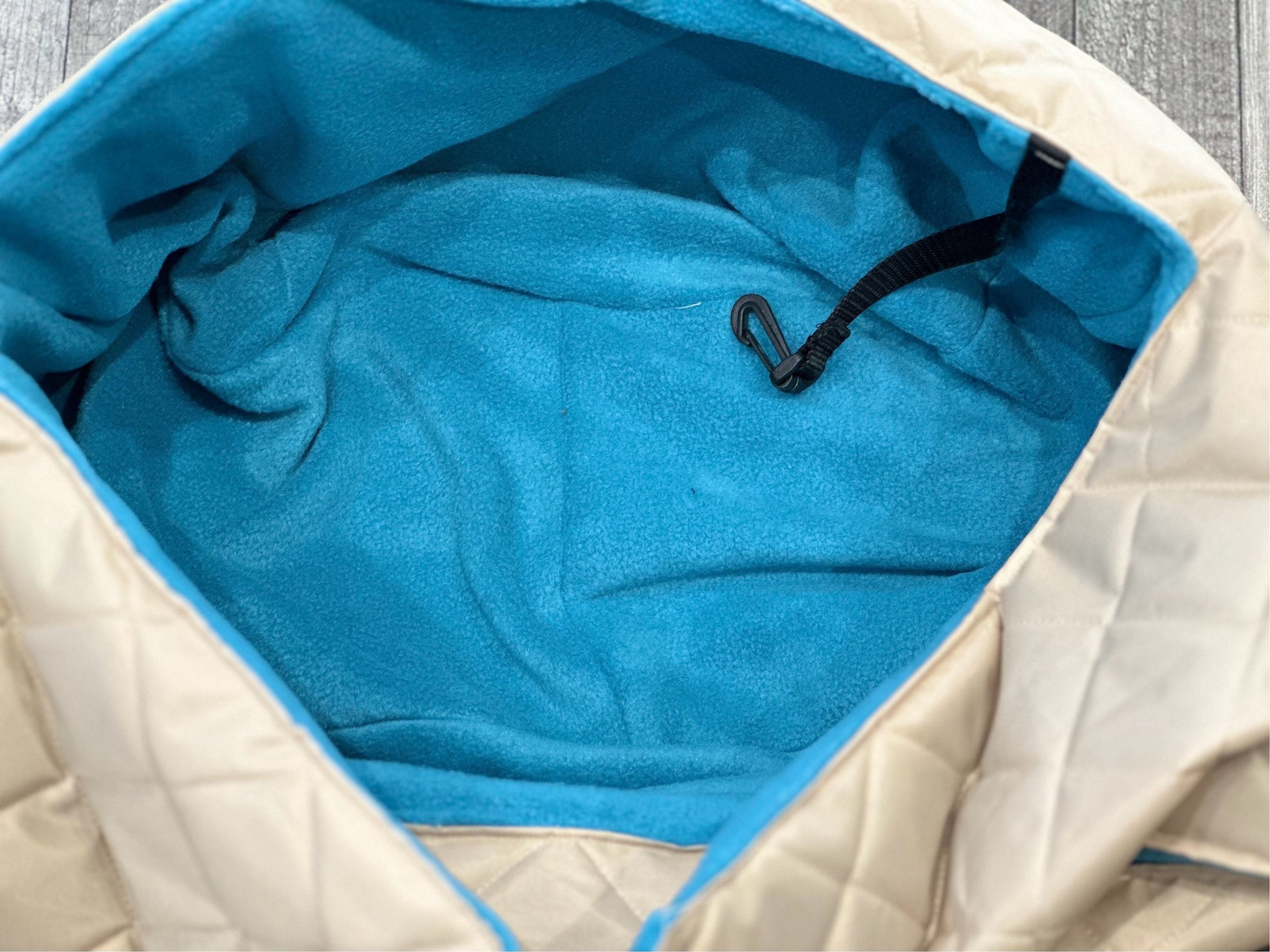 quilted waterproof sling which is fully lined in polar fleece it has a Swivel Hook inside to keep your dog safe by attaching it to collar or harness This sling carrier is lightweight and comfortable to use The sling has darts at the bottom to give it shape. the sling has a tapered strap the sling is designed to sit/ hang past the hip depending on your height it sits just blow my hip the sling evenly distributes the weight of your dog, making it easier than ever to carry them. the sling can be used all day relieving tension in your neck, back, shoulders and arms the sing sizes small 17inch’s wide at the top 15.5 inch’s wide in the middle and 14.5 inches above the darts 11 inch’s high 8” inch’s wide on the base & side then tapering off the strap is 24 inches long medium 20 inch’s wide at the top 19 inch’s wide in the middle and 17 inches above the darts 13 inch’s high 8” inch’s wide on the base & side then tapering off the strap is 24 inches long large 24 inch’s wide at the top 23 inch’s wide in the middle and 22 inches above the darts 13 inch’s high 8” inch’s wide on the base & side then tapering off the strap is 24 inches long maximum weight 10kg It's incredibly easy to carry around , making it perfect for public places. It’s fully washable at 30 degrees and air dry only This is made in a pet and smoke free studio This is a made to order item