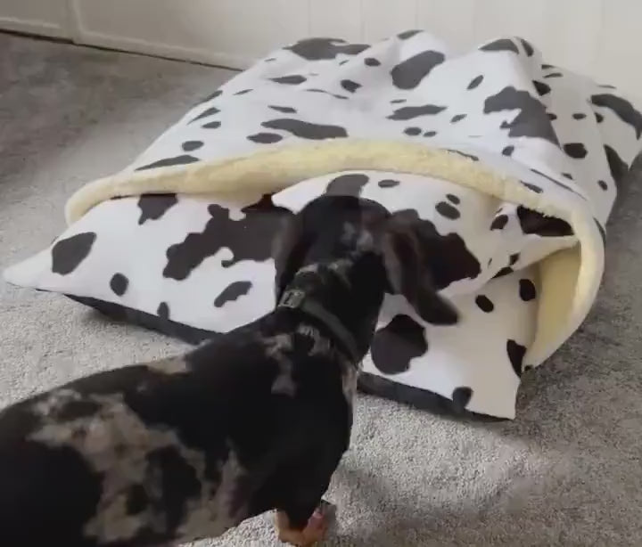 Fleece Dog Bed Cave: Dachshund Snuggle Sack with Sherpa Lining.