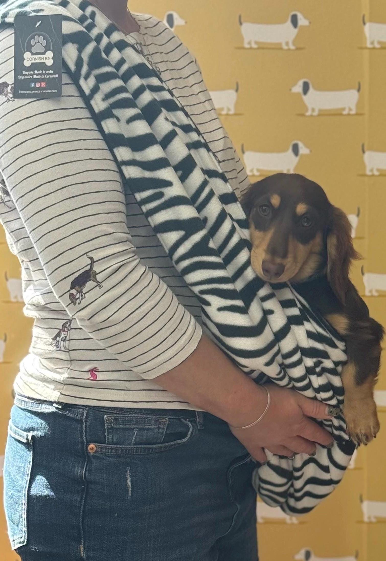 polar fleece dog sling fully lined in fleece cow and zebra print come with black fleece lining green geometric circles and tiger print come with a beige fleece lining it has a Swivel Hook inside to keep your dog safe by attaching it to collar or harness This sling carrier is lightweight and comfortable to use The sling has darts at the bottom to give it shape. the sling has a tapered strap the sling is designed to sit/ hang past the hip depending on your height it sits just blow my hip the sling evenly distributes the weight of your dog, making it easier than ever to carry them. the sling can be used all day relieving tension in your neck, back, shoulders and arms the sing sizes small 17inch’s wide at the top 15.5 inch’s wide in the middle and 14.5 inches above the darts 11 inch’s high 8” inch’s wide on the base & side then tapering off the strap is 24 inches long medium 20 inch’s wide at the top 19 inch’s wide in the middle and 17 inches above the darts 13 inch’s high 8” inch’s wide on the base & side then tapering off the strap is 24 inches long maximum weight 10kg large 24 inch’s wide at the top 23 inch’s wide in the middle and 22 inches above the darts 13 inch’s high 8” inch’s wide on the base & side then tapering off the strap is 24 inches long maximum weight 10kg It's incredibly easy to carry around , making it perfect for public places. It’s fully washable at 30 degrees This is made in a pet and smoke free studio This is a made to order item