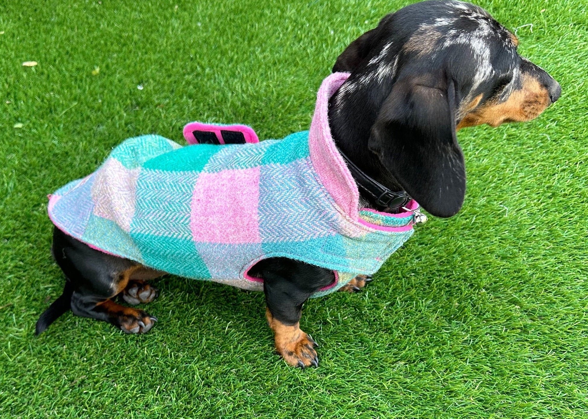 Harris tweed dachshund chest covering coat with collar lined In fleece all the outer fabric has been interfaced to give the coat more structure and durability The coat can be made with a Harness hole just add a note saying harness hole the coat has darts in back to give it shape the coat fastens underneath with a Velcro straps and around the neck the coat is Stitched with Strong bonded nylon thread which is rote proof I can add length to each size and girth if needed please see size chart for measurements Please note there might be a few centimetres difference in each coat as there all hand cut out Harris tweed naturally repels water and dirt so a quick brush is all that is needed. If in the event that your item needs washing,low heated wash only air dry For reference my Winnie in the photos is wearing a Xs This is a made to order item made by me in a smoke free studio Please note the coat may differ in colour slightly depending on your screen resolution and Camera light Please visit my shop to see my other dog harness and dog coats