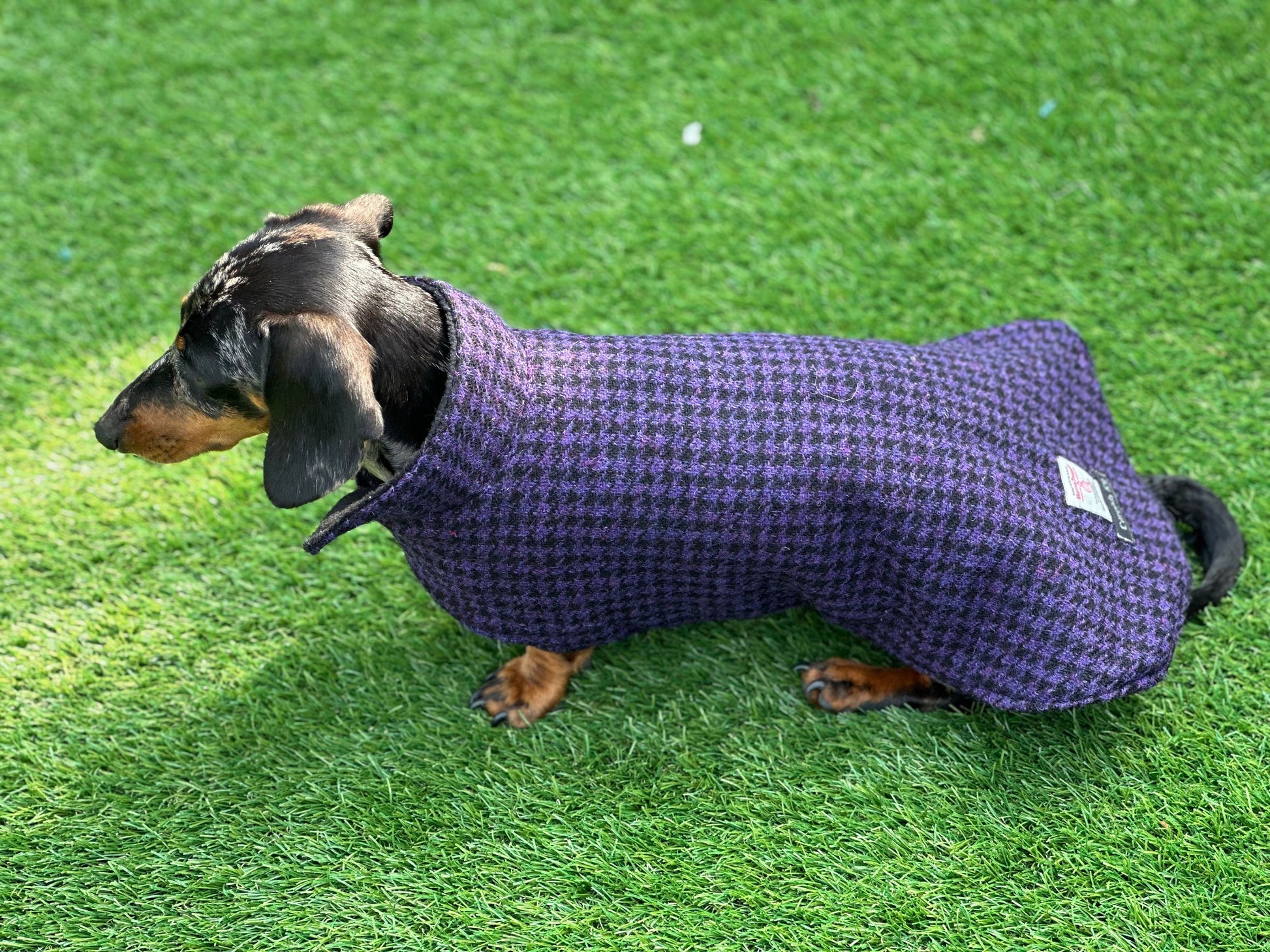 Harris tweed dachshund coat with collar lined In fleece all the outer fabric has been interfaced to give the coat more structure and durability The coat can be made with a Harness hole or Dring just add a note if you would require one the dachshund in the photos is wearing a xs with added length in purple houndstooth the coat fastens underneath with a Velcro straps and around the neck the coat is Stitched with Strong bonded nylon thread which is rote proof I can add length to each size and girth if needed please see size chart for measurements Please note there might be a few centimetres difference in each coat as there all hand cut out Harris tweed naturally repels water and dirt so a quick brush is all that is needed. If in the event that your item needs washing,low heated wash only air dry This is a made to order item made by me in a smoke free studio Please note the coat may differ in colour slightly depending on your screen resolution and Camera light Please visit my shop to see my other dog harness and dog coats