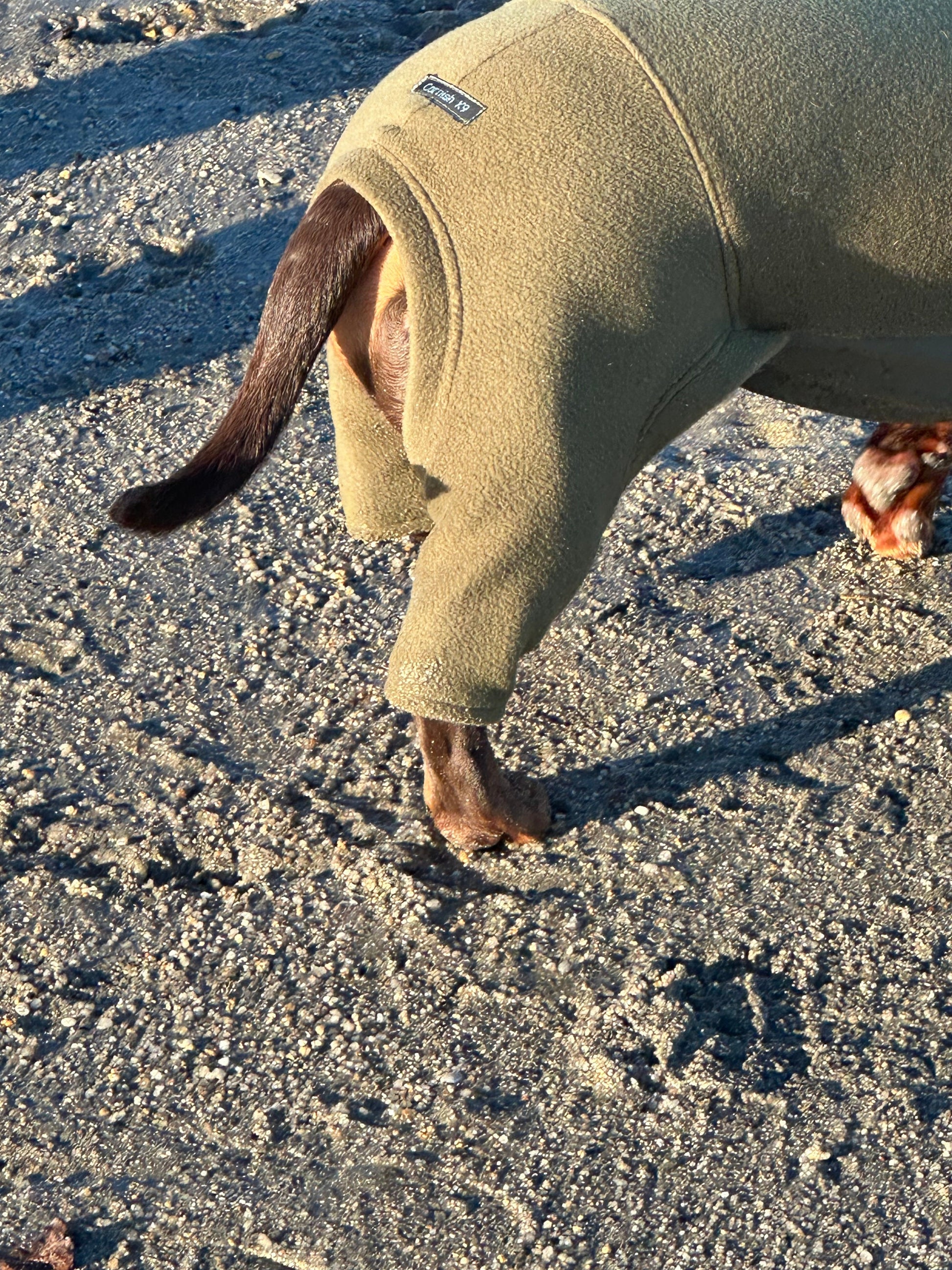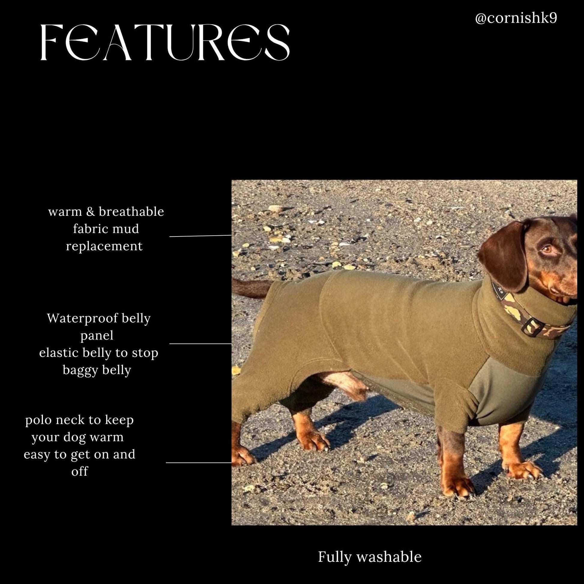 This is our Cornish K9 must have for the winter our miniature dachshund fleece onesie have a water resistant belly in Softshell fabric so no more wet soggy bellies the has elastic to help give it shape so no baggy belly The fleece will match the soft shell belly panel the onesie is Water & Mud Repellent This is a slip on jumper PLEASE NOTE THIS FABRIC DOES NOT STRETCH LIKE FLEECE. please note there might be a bit of shrinkage once washed The oneise sizes are from back of the neck to were the tail begins Xs length 32-35cm chest 32-38 neck 22-26cm Small Length 36-40 cm chest 39-45cm neck 25-30cm Medium length 40-45cm chest 44-49cm neck 29-34cm Large length 43-47cm chest 49-54cm neck 33-37cm XL length 46-50cm chest 55-60cm neck 35-40cm All seams have been overlocked to stop fraying please double check before ordering else your item will either be to big or too small for your dog Please note there might be a few centimetres difference in each coat as there all hand cut out When coat needs washing,low heated wash only air dry I do have other sizes available for other dog breeds just drop me message with neck length girth and chest width this widest part between the top of each leg Water Resistant: Fleece is hydrophobic, meaning that it cannot absorb water. This is great for dogs who are likely to get stuck in the rain and mud . However, the fabric is not waterproof, although it will dry quickly if it becomes wet. Warmth: The warmth of fleece is mainly due to its ability to trap your body’s heat. This is similar to down jackets, minus the weight. If warmth is what you are looking for, a polar fleece jacket is exactly what you need. Breathability: Another key part of a fleece jacket is its breathability. Fleece jackets are great for dogs who are active because they provide warmth without causing you to sweat too much or become overheated. for reference my standard dachshund in the photos is wearing a XL with add length This is a made to order item made by me in a smoke free studio Please note the coat may differ in colour slightly depending on your screen resolution and Camera light Please visit my shop to see my other dog harness and dog coats