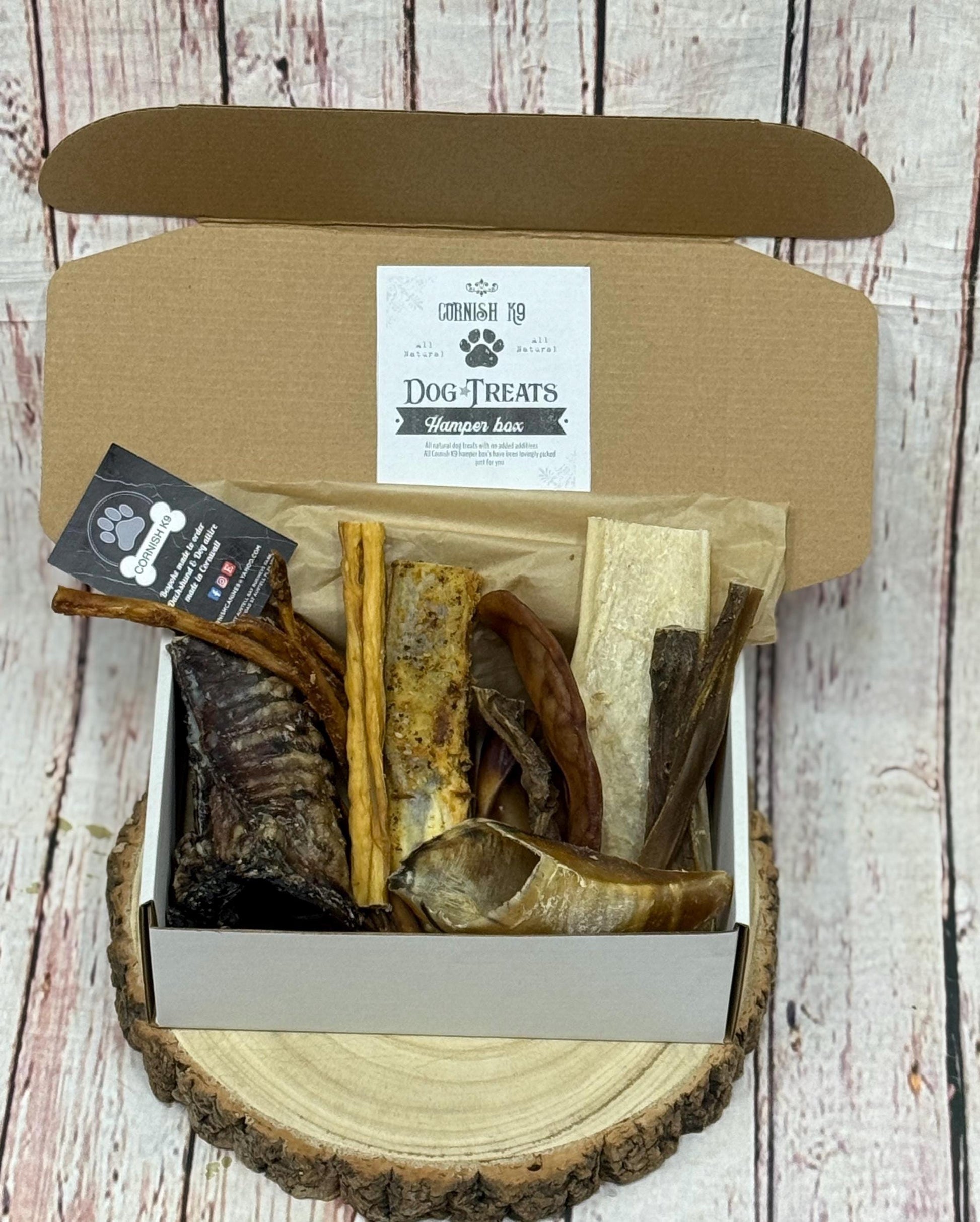 chew hamper Box from our Cornish K9 natural Dog Treat section Your dog will find these treats absolutely irresistible. These are some of our most popular treats in store. we haven't found a dog yet that doesn't love them! in this hamper you will get 1 x large Trecha 5 x beef spaghetti 2 x beef ribs 2 x buffalo steaks 1 x pigs ears 3 x lamb shoulder 1 x cow hoof 2 x camel skin 2 x beef muscle These are Suitable for all dogs and puppies aged 14 weeks and over Suitable for puppies aged 14 weeks+ Grain free Made in the UK All items are hand-picked and are of the very best quality. 100% natural, air-dried products as nature intended. Store in a cool dry place away from direct sunlight. Keep out of reach from children.