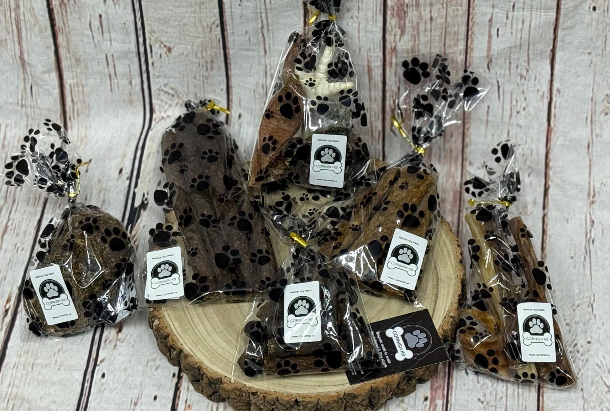 national tester treat bags from our Cornish K9 natural Dog Treat section Your dog will find these treats absolutely irresistible. These are some of our most popular treats in store. we haven't found a dog yet that doesn't love them! there’s 6 different treats bags to choose from mini sausages bag 3 x mini liver sausages 3 x mini pork & chicken sausages 3 x mini beef & garlic sausages chew bag 1 pig ear strip 1 beef muscle 1 beef curl 1 camel skin 1 chicken foot 1 beef spaghetti mix bag 1 beef heart 1 chicken fillet 1 chicken neck 2 fish cubes 1 tripe stick 1 puffed chicken foot long sausage bag 1 long black pudding sausage 1 long chicken & cheese sausage 1 long ribbit sausage 1 long venison sausage meaty strips 2 duck strips 2 goose strips 2 chicken strips burgers 2 venison 2 beef 2 chicken These are Suitable for all dogs and puppies aged 12 weeks and over Suitable for puppies aged 12 weeks+ Grain free Made in the UK All items are hand-picked and are of the very best quality. 100% natural, air-dried products as nature intended. Store in a cool dry place away from direct sunlight. Keep out of reach from children.