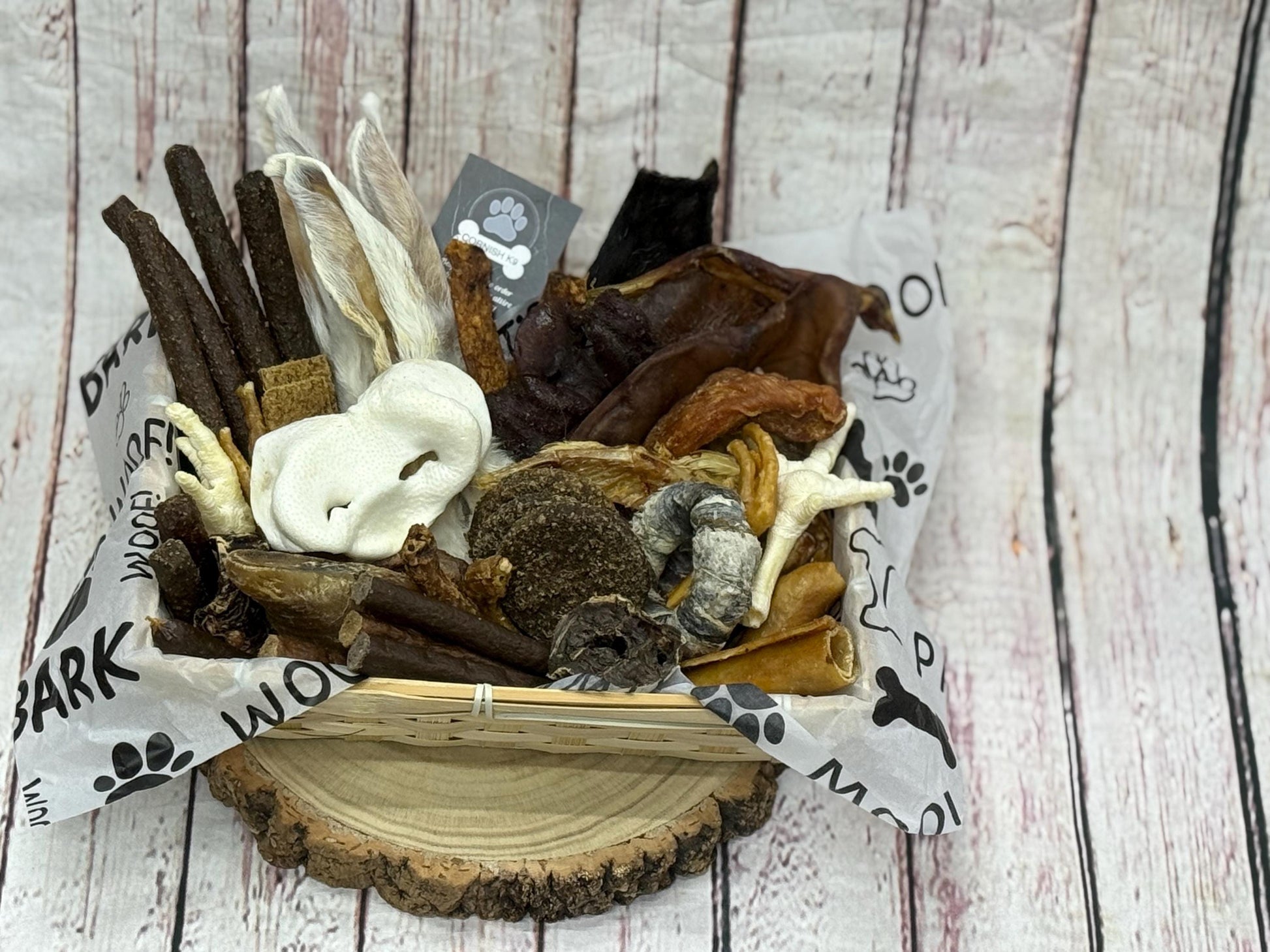 mega variety hamper Box from our Cornish K9 natural Dog Treat section Your dog will find these treats absolutely irresistible. These are some of our most popular treats in store. we haven't found a dog yet that doesn't love them! in this hamper you will get 4 x long rabbit sausages 1 x pigs ear 1 x beef moon bone 1 x venison burger 2 x chicken necks 1 x Trachea 2 x pigs in blankets 1 x fish ring 1 x duck wing 1 x cow hoof 1 x goat ear with fur 2 x chicken burgers 2 x beef hearts 1 x pig snot 2 x puffed chicken feet 2 x chicken meaty strips 2 x tripe sticks 2 x lamb & rice sticks 2 x chicken feet 3 x liver mini sausages 1 x chicken fillet That's 40 delicious items These are Suitable for all dogs and puppies aged 14 weeks and over Suitable for puppies aged 14 weeks+ Grain free Made in the UK All items are hand-picked and are of the very best quality. 100% natural, air-dried products as nature intended. Store in a cool dry place away from direct sunlight. Keep out of reach from children.