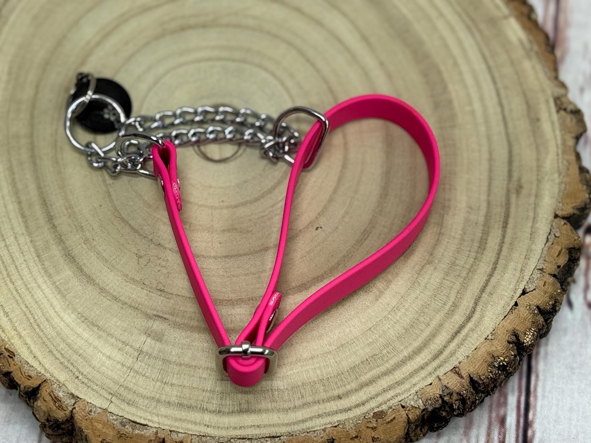 half chain collar with matching led it’s made with silver hardware the collar is small size for necks 11 to 13 inches the lead is 50 inches in length Biothane is durable, waterproof and easy to clean and resistant to UV damage A stronger, anti-odour and vegan alternative to leather. Our Biothane collars are made for everyday use but are particularly great in water, whether its in the rain , muddy puddle or swimming in the sea .