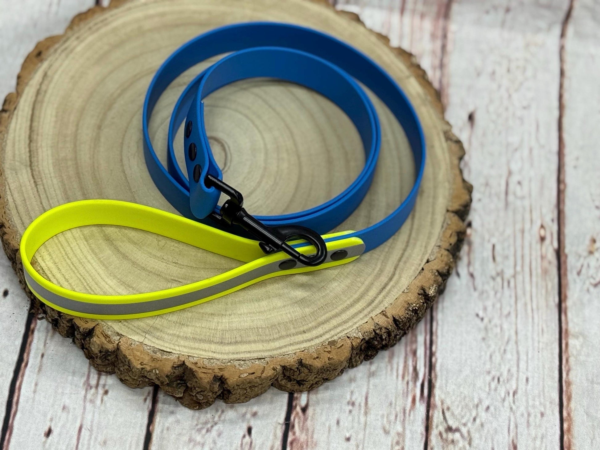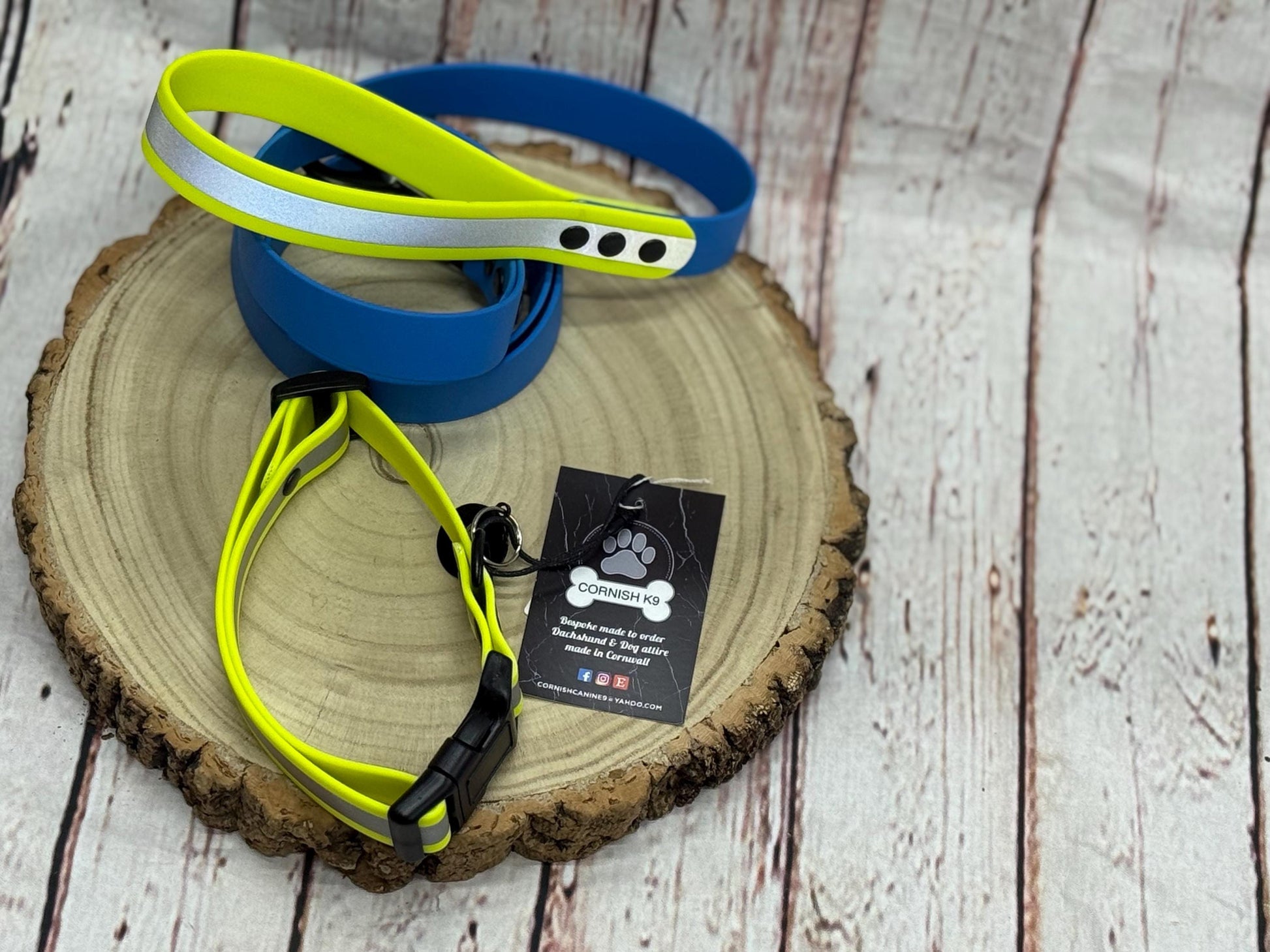 quick release collar with matching led it’s made with black metal hardware but black plastic side realise buckle the collar is medium size for necks 13 to 16 inches the lead is 50 inches in length Biothane is durable, waterproof and easy to clean and resistant to UV damage A stronger, anti-odour and vegan alternative to leather. Our Biothane collars are made for everyday use but are particularly great in water, whether its in the rain , muddy puddle or swimming in the sea .