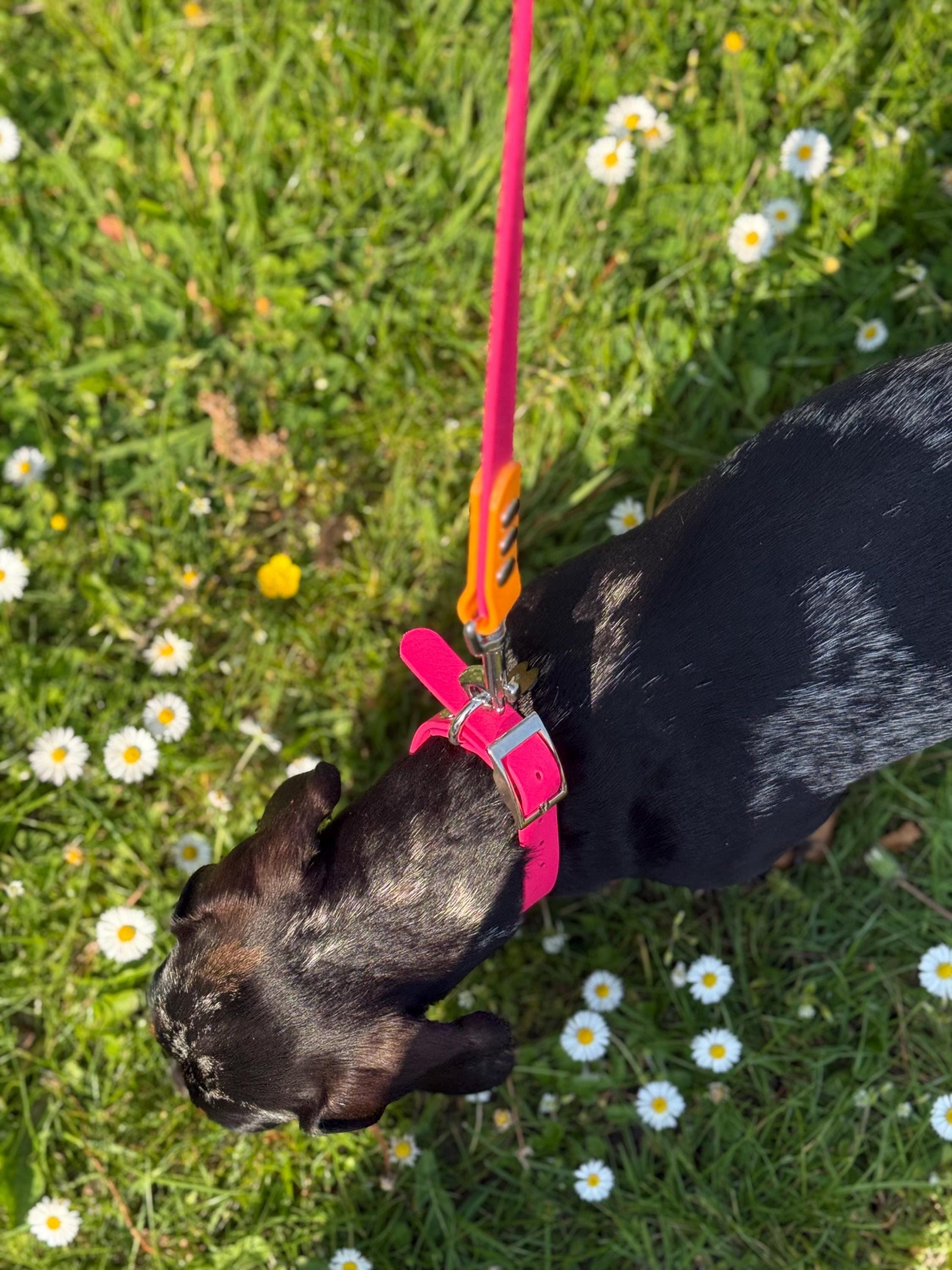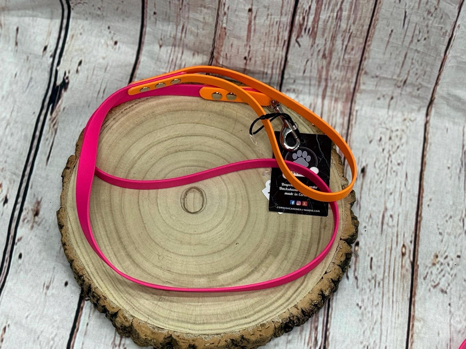 buckle collar with matching led it’s made with silver hardware the collar is small size for necks 11 to 13 inches the lead is 50 inches in length Biothane is durable, waterproof and easy to clean and resistant to UV damage A stronger, anti-odour and vegan alternative to leather. Our Biothane collars are made for everyday use but are particularly great in water, whether its in the rain , muddy puddle or swimming in the sea .