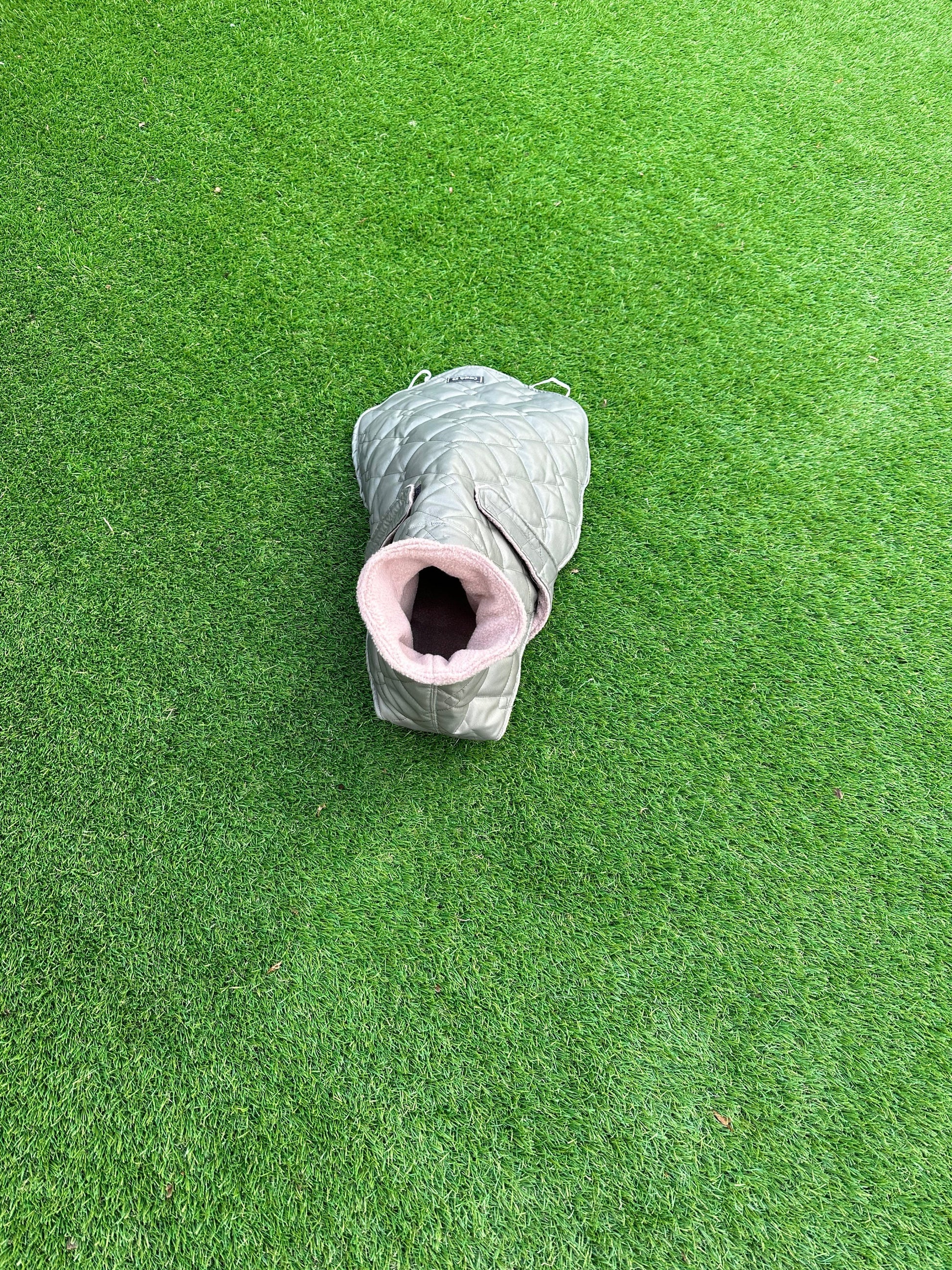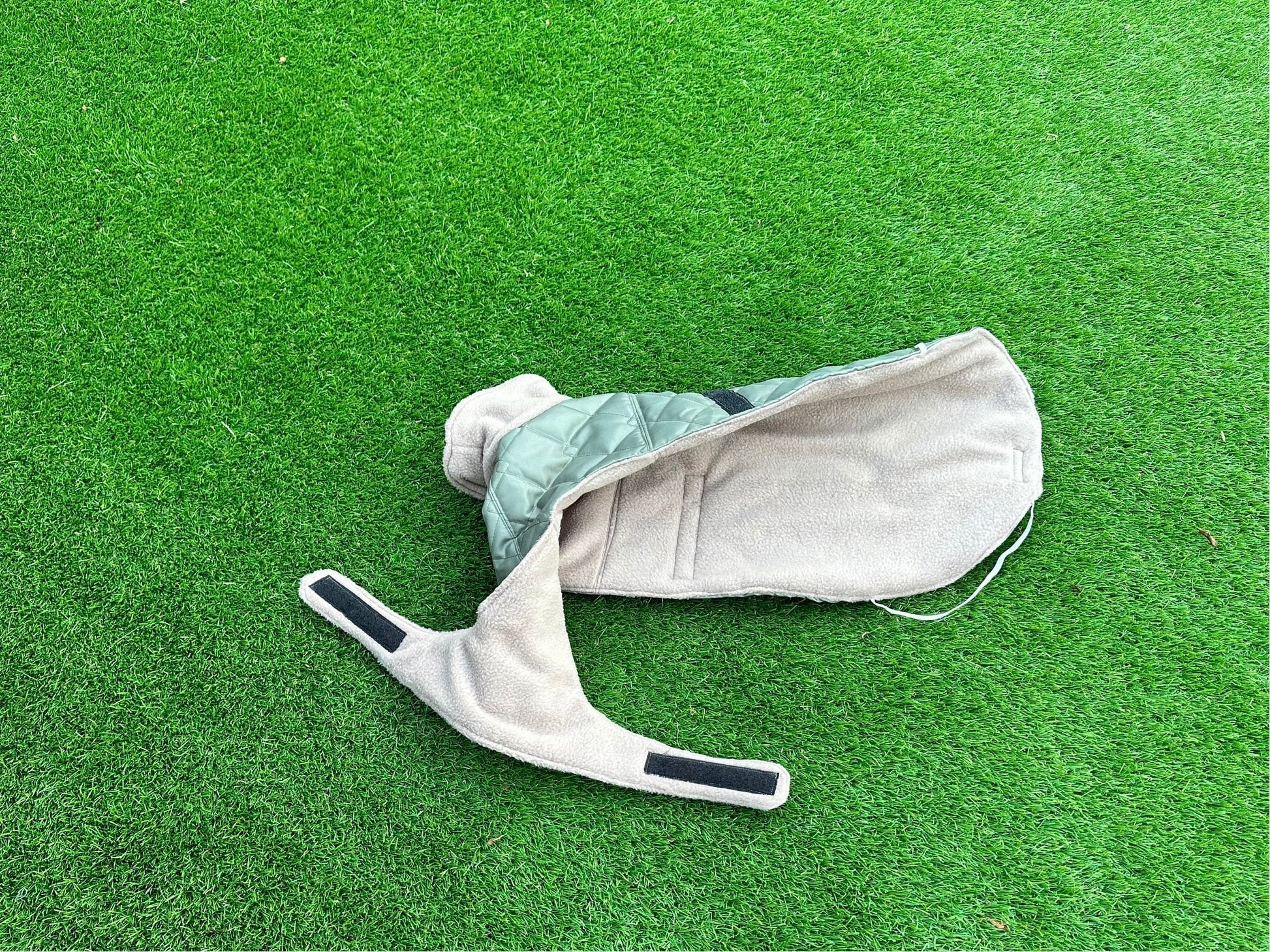 Waterproof Dog coat that covers chest with neck warmer lined with fleece The coat has a harness hole but a dring can be attached If you preferred just add a note saying d ring This is a waterproof dog coat the coat fastens on the sides with hock and loop the coat is Stitched with Strong bonded nylon thread which is rote proof This Coat comes in these sizes ,but I can add a few cm’s to the length if needed I would recommend going by the neck and chest measurements As for reference my Roo in the photo has a neck off 33cm girth of 55cm and length of 48cm and he wears a large where his measurements are a XL Xs neck 25-27cm girth 38-40 length 29cm Small neck27-29 girth 42-44 length 33 cm Medium neck 28-30 girth 44-46 length 38cm Large neck 29-31 girth 46-48 length 43cm XL neck 30-32 girth 48-50 length 48 cm Please double check your sizes before ordering Please note there might be a few centimetres difference in each coat as there all hand cut out The waterproof quilted fabric naturally repels water and dirt so a quick brush is all that is needed. If in the event that your item needs washing,low heated wash only air dry This is a made to order item made by me in a smoke free studio Please note the coat may differ in colour slightly depending on your screen resolution and Camera light