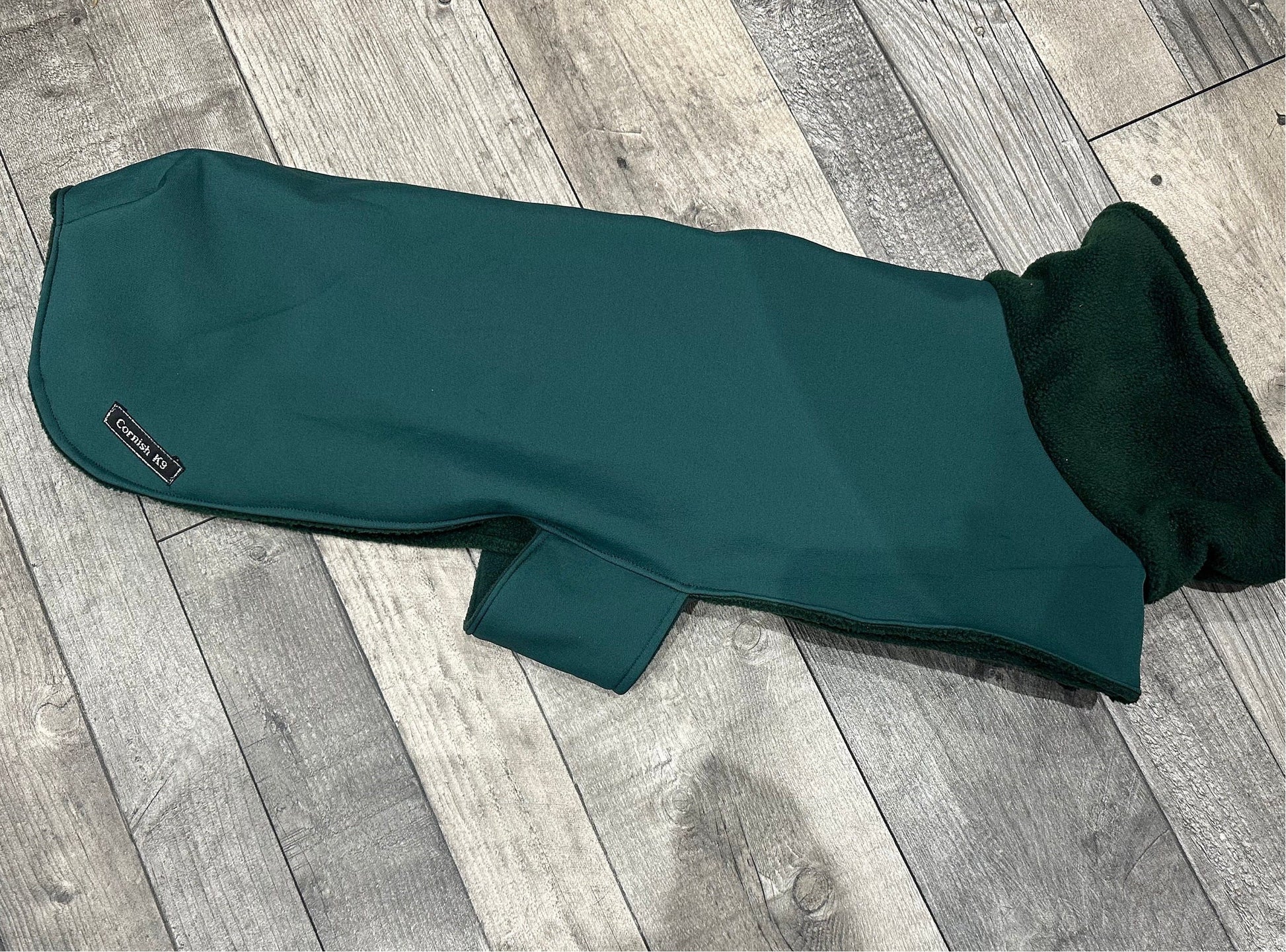 Soft shell water resistant & wind proof polo Dog coat lined In fleece I will try to add matching fleece but if I can’t it will be lined with black fleece The coat has a Harness hole so you can clip your dog lead to if you don’t want a hole just add a not saying no hole This is a water resistant and wind proof dog coat the has elastic straps for the back legs the coat fastens underneath with a Velcro strap the coat is Stitched with Strong bonded nylon thread which is rote proof This Coat comes in but I can add length to each size Xxs from base of neck to base of tail 10” X Small from base of neck to base of tail 12” Small from base of neck to base of tail 14” Medium from base of neck to base of tail 16” Large from base of neck to base of tail 18” Xl from base of neck to base of tail 20” Please note there might be a few centimetres difference in each coat as there all hand cut out The waterproof Softshell naturally repels water and dirt so a quick brush is all that is needed. If in the event that your item needs washing,low heated wash only air dry This is a made to order item made by me in a smoke free studio Please note the coat may differ in colour slightly depending on your screen resolution and Camera light Please visit my shop to see my other dog harness and dog coats