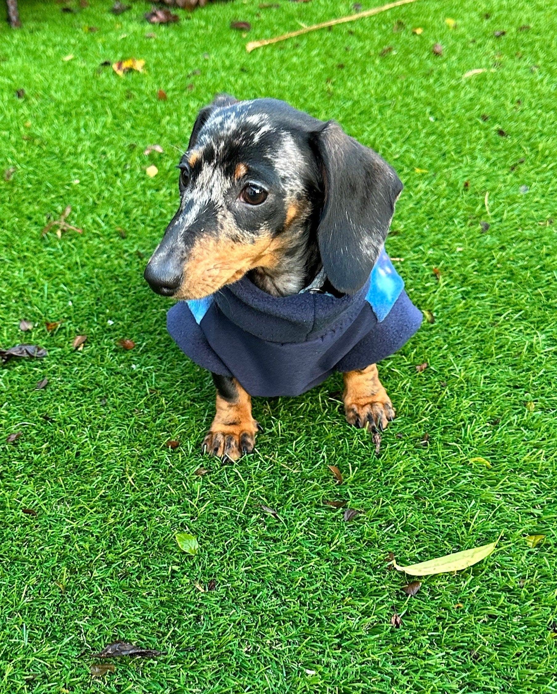 galaxy dachshund fleece jumper with waterproof soft shell tummy with nany fleece and navy soft shell tummy This is a slip on jumper PLEASE NOTE THIS FABRIC DOES NOT STRETCH LIKE FLEECE. You can get your dog in and out without a zip but for elderly or arthritic dogs i would recommend ordering a zip. Please note the jumper may be a bit big to begin with to allow for shrinkage once washed The coats sizes are from back of the neck to were the tail begins Xs length 32cm chest 32-39cm neck 20-24cm Small Length 37 cm chest 39-44cm neck 24-29 Medium length 41cm chest 44-49cm neck 29-34cm Large length 43cm chest 49-54cm neck 33-38cm XL length 45cm chest 55-60cm neck 36-41cm All seams have been overlocked personalised items are non refundable please double check before ordering else your item will either be to big or too small for your dog or message me for help Please note there might be a few centimetres difference in each coat as there all hand cut out When coat needs washing wash at 30 degrees only air dry I do have other sizes available for other dog breeds just drop me message with neck length girth sizes All items are made by myself from my pet accessories business called Cornish K9 Water Resistant: Fleece is hydrophobic, meaning that it cannot absorb water. This is great for dogs who are likely to get stuck in the rain and mud . However, the fabric is not waterproof, although it will dry quickly if it becomes wet. Warmth: The warmth of fleece is mainly due to its ability to trap your body’s heat. This is similar to down jackets, minus the weight. If warmth is what you are looking for, a polar fleece jacket is exactly what you need. Breathability: Another key part of a fleece jacket is its breathability. Fleece jackets are great for dogs who are active because they provide warmth without causing you to sweat too much or become overheated. This is a made to order item made by me in a smoke free studio Please note the coat may differ in colour slightly depending on your screen resolution and Camera light Please visit my shop to see my other dog harness and dog coats