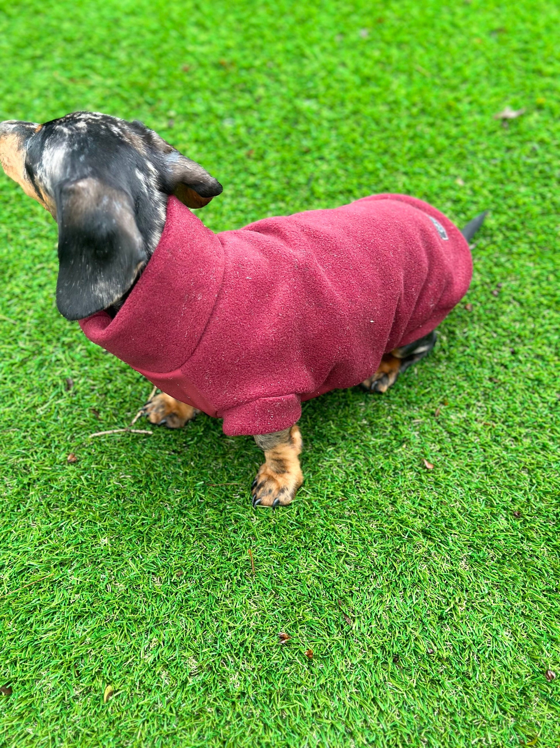 dachshund fleece jumper with waterproof soft shell tummy the fleece will match the soft shell tummy unless you’ve asked for a different colour This is a slip on jumper PLEASE NOTE THIS FABRIC DOES NOT STRETCH LIKE FLEECE. You can get your dog in and out without a zip but for elderly or arthritic dogs l would recommend ordering a zip. Please note the jumper may be a bit big to begin with to allow for shrinkage once washed The coats sizes are from back of the neck to were the tail begins Xs length 32cm chest 32-39cm neck 20-24cm Small Length 37 cm chest 39-44cm neck 24-29 Medium length 41cm chest 44-49cm neck 29-34cm Large length 43cm chest 49-54cm neck 33-38cm XL length 45cm chest 55-60cm neck 36-41cm All seams have been overlocked personalised items are non refundable please double check before ordering else your item will either be to big or too small for your dog or message me for help Please note there might be a few centimetres difference in each coat as there all hand cut out When coat needs washing wash at 30 degrees only air dry I do have other sizes available for other dog breeds just drop me message with neck length girth sizes All items are made by myself from my pet accessories business called Cornish K9 Water Resistant: Fleece is hydrophobic, meaning that it cannot absorb water. This is great for dogs who are likely to get stuck in the rain and mud . However, the fabric is not waterproof, although it will dry quickly if it becomes wet. Warmth: The warmth of fleece is mainly due to its ability to trap your body’s heat. This is similar to down jackets, minus the weight. If warmth is what you are looking for, a polar fleece jacket is exactly what you need. Breathability: Another key part of a fleece jacket is its breathability. Fleece jackets are great for dogs who are active because they provide warmth without causing you to sweat too much or become overheated. This is a made to order item made by me in a smoke free studio Please note the coat may differ in colour slightly depending on your screen resolution and Camera light Please visit my shop to see my other dog harness and dog coats