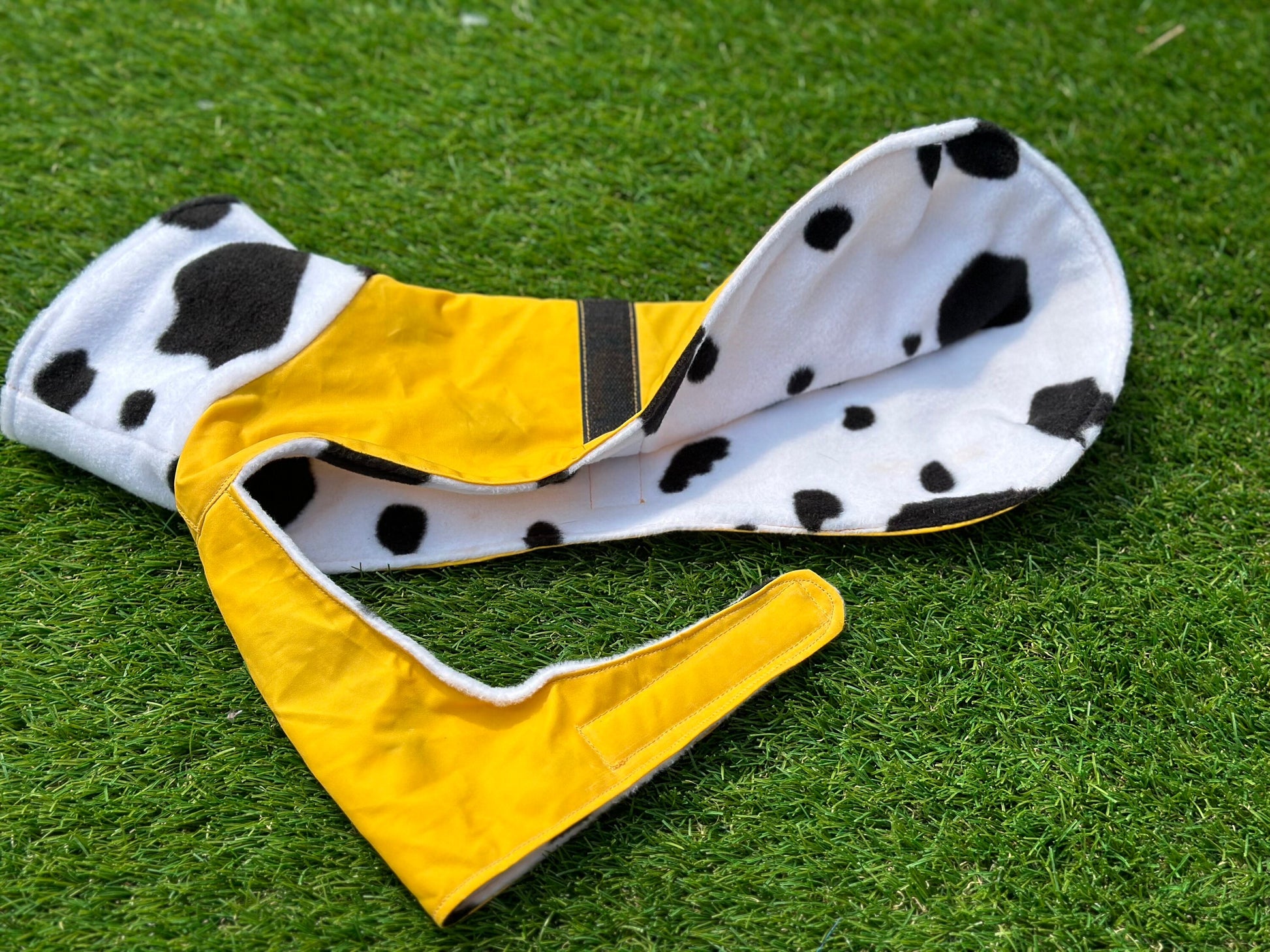 Waterproof dry wax dachshund coat that covers chest with neck warmer lined with fleece there is darts in the back to give the coat shape The coat can be made with a harness hole or a dring just add a note if you would like with one This is a waterproof dog coat Waxed canvas is a densely woven cotton fabric that has been saturated with wax, giving it an extra layer of protection against the elements. This fabric has been long-loved for its durability, natural water resistance, and rugged character. There is a selection of fleeces to choose from the coat fastens on the sides with hock and loop the coat is Stitched with Strong bonded nylon thread which is rote proof This Coat comes in these sizes ,but I can adjust the length if needed Xxs neck 6-8 inches girth 12-14 inches length 10 inches Xs neck 9-11 inches girth 14-17 inches length 12 inches Small neck 10-13inches girth 17-21 inches length 14 inches Medium neck 12-15 inches girth 21-24inches length 16inches Large neck 15-16 inches girth 25-28 inches length 18 inches I would recommend by going by the girth & neck measurements for reference my Winnie in the photo is wearing a xs in mustard with cow print fleece with added length Please double check your sizes before ordering Please note there might be a few centimetres difference in each coat as there all hand cut out The waterproof dry wax fabric naturally repels water and dirt so a quick brush is all that is needed. If in the event that your item needs washing,low heated wash only air dry This is a made to order item made by me in a smoke free studio Please note the coat may differ in colour slightly depending on your screen resolution and Camera light
