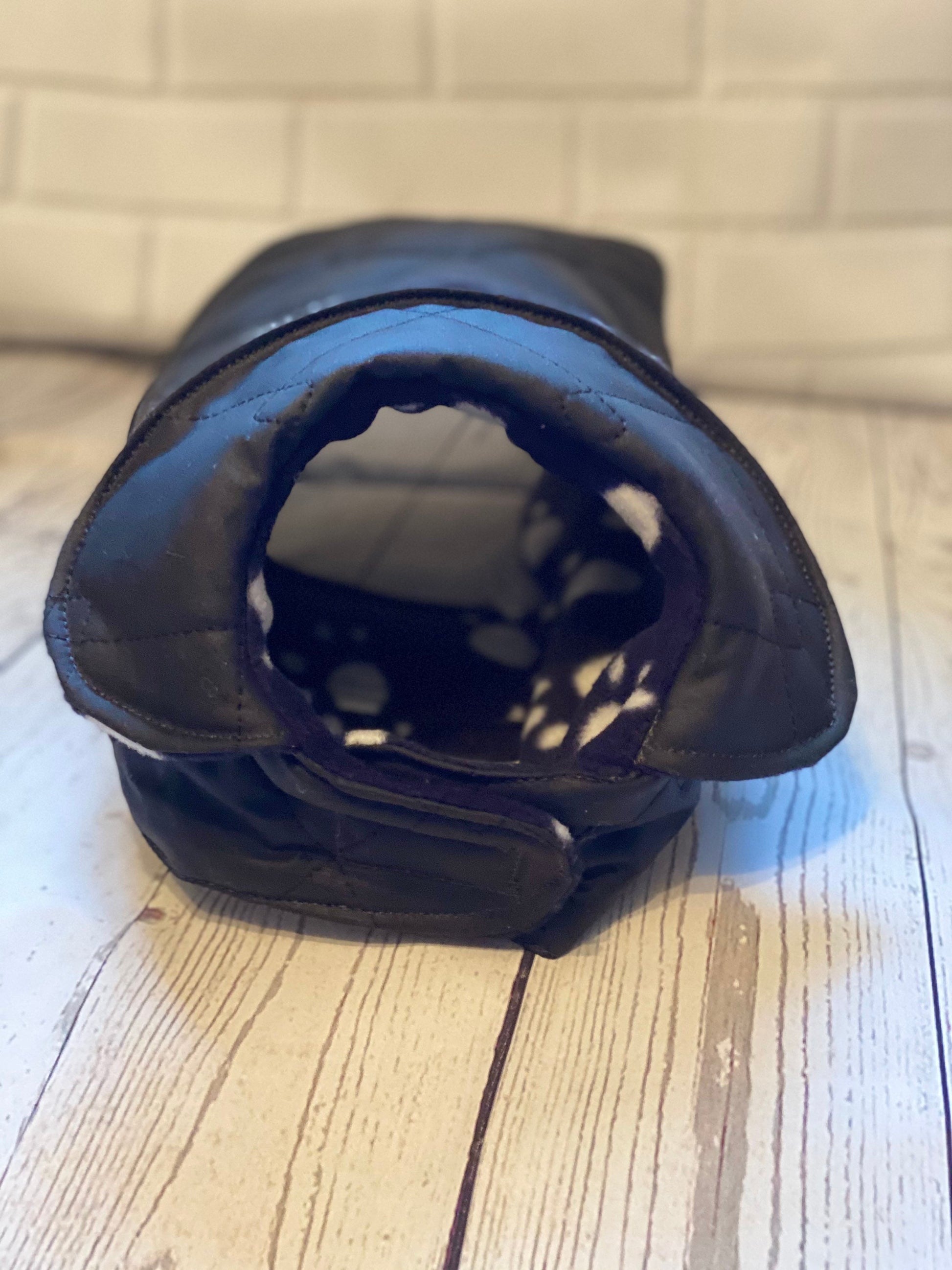 Waxed Quilted Dog coat with collar lined in a black paw print fleece The coat has a D ring attached so you can clip your dog lead to but harness hole can be added This is a waterproof / shower proof dog coat the coat fastens underneath with hock and loop the coats are Stitched with Strong bonded nylon thread which is Rot proof The waterproof quilted nylon naturally repels water and dirt so a quick brush is all that is needed. If in the event that your item needs washing,low heated wash only air dry only Please note there might be a few centimetres difference in each coat as there all hand cut out Please note the coat may differ in colour slightly depending on your screen resolution and Camera light This is a ready to ship item made by me in a smoke free studio Please visit my shop to see my other dog harness and dog coats